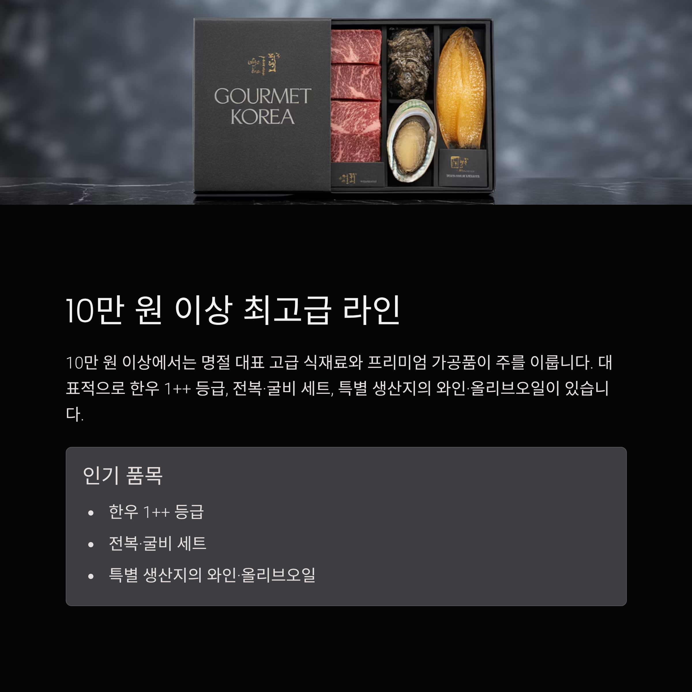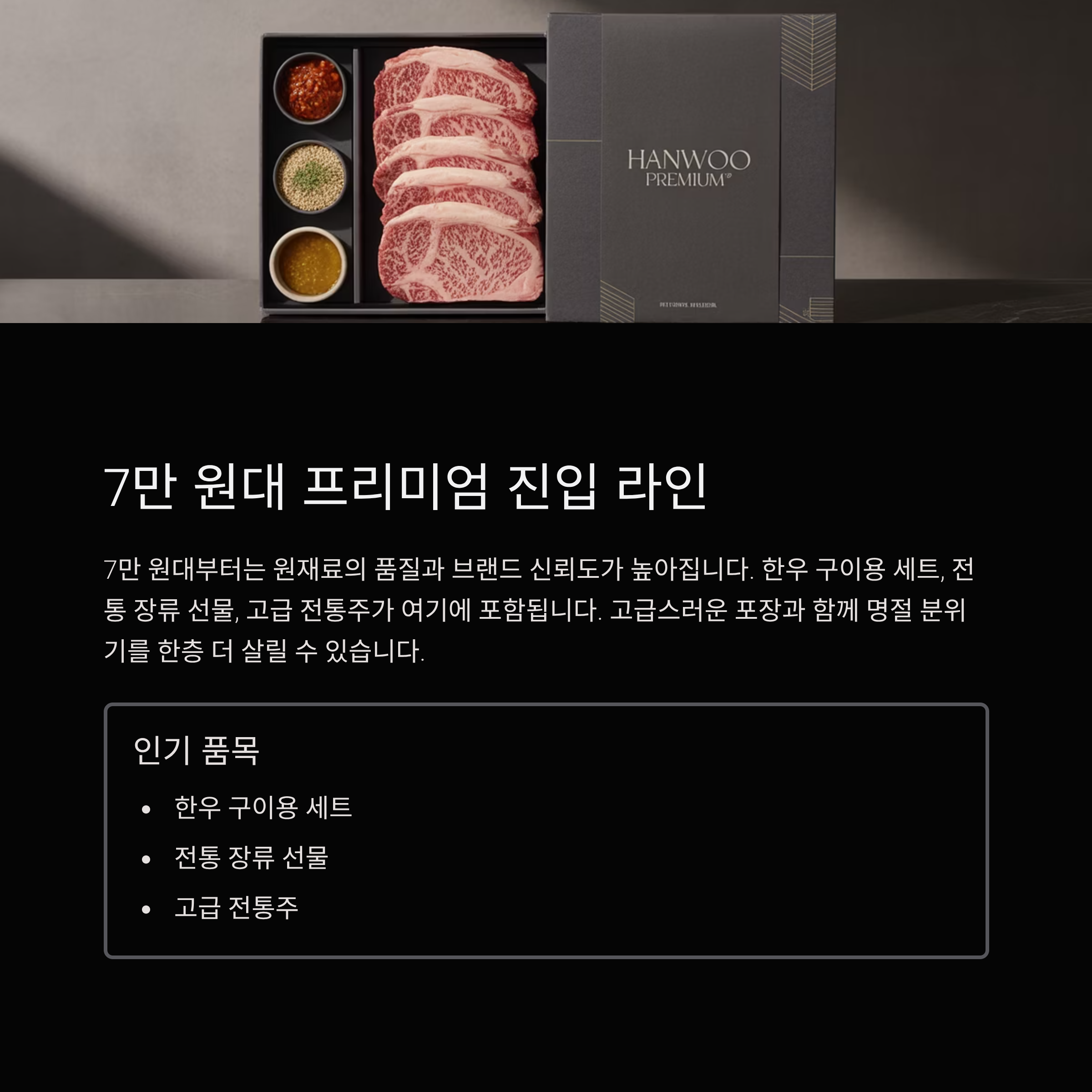 한우 구이용 세트, 전통 장류 선물, 고급 전통주가 여기에 포함됩니다.