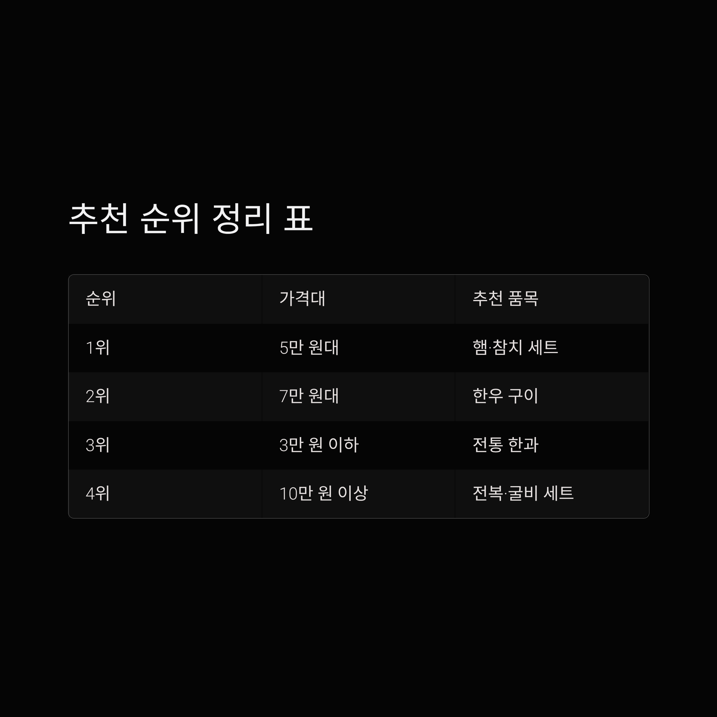 가격대별 인기 품목 비교표