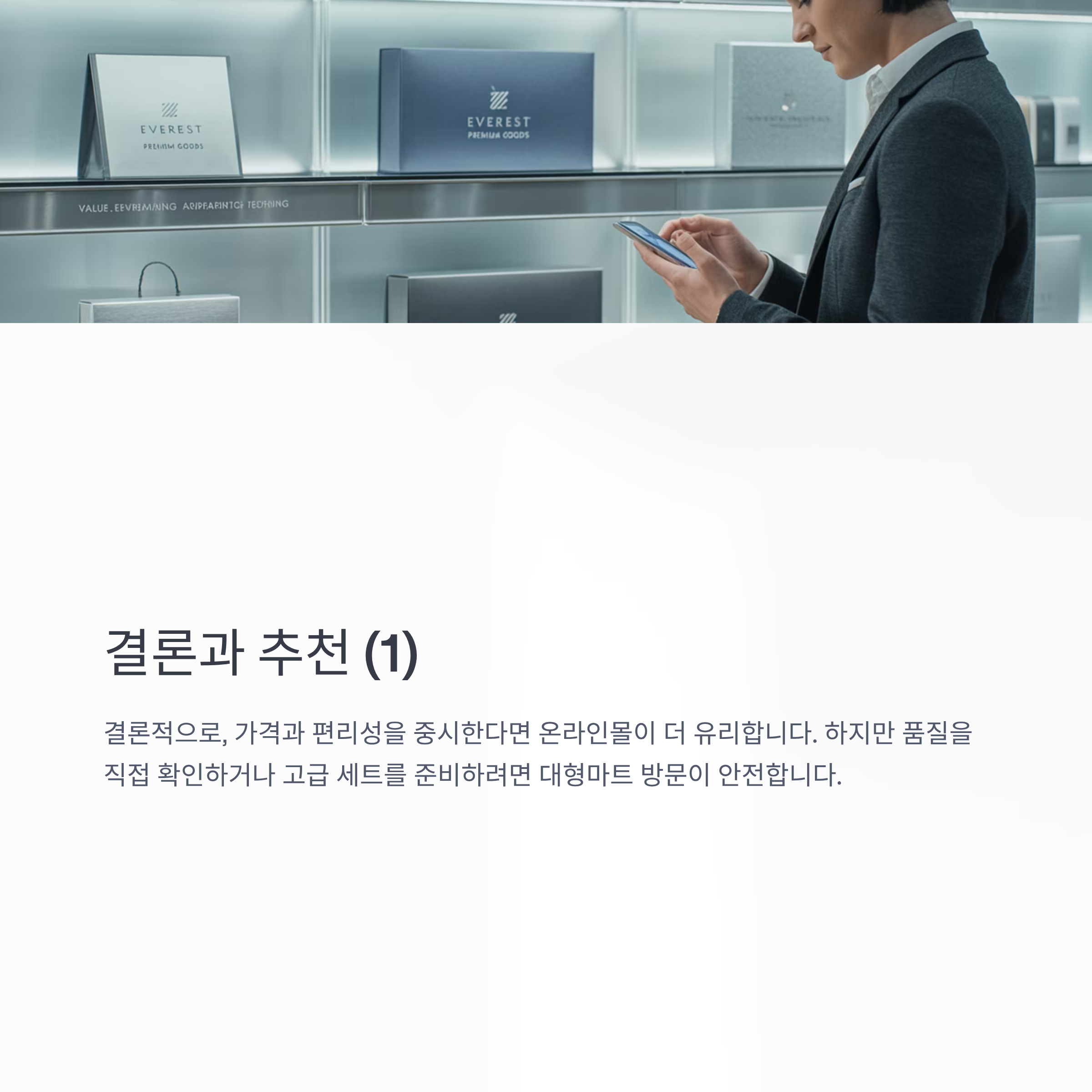 결론적으로, 가격과 편리성을 중시한다면 온라인몰이 더 유리합니다. 하지만 품질을 직접