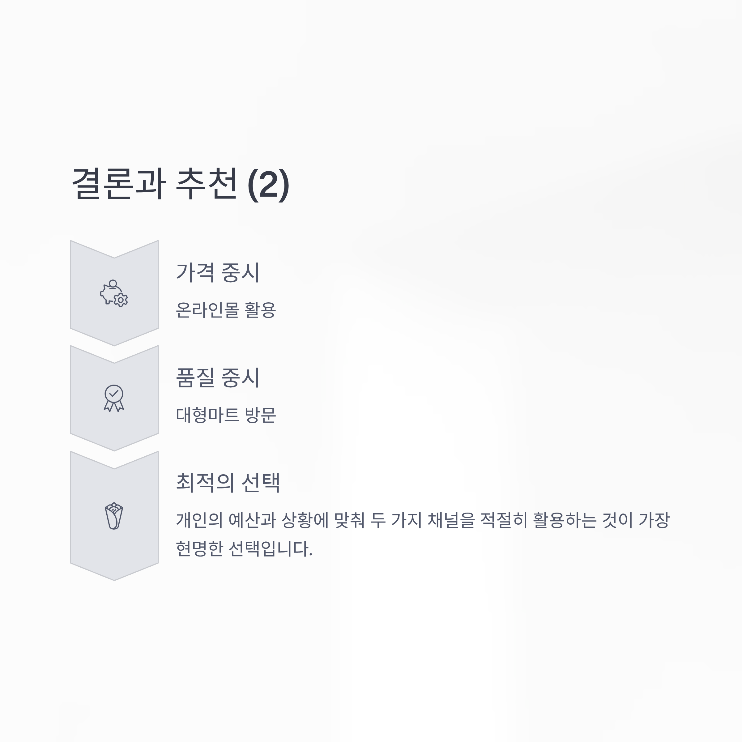 쉽지 않은 고민입니다. 대형마트는 직접 확인할 수 있는 장점이 있지만, 온라인몰은