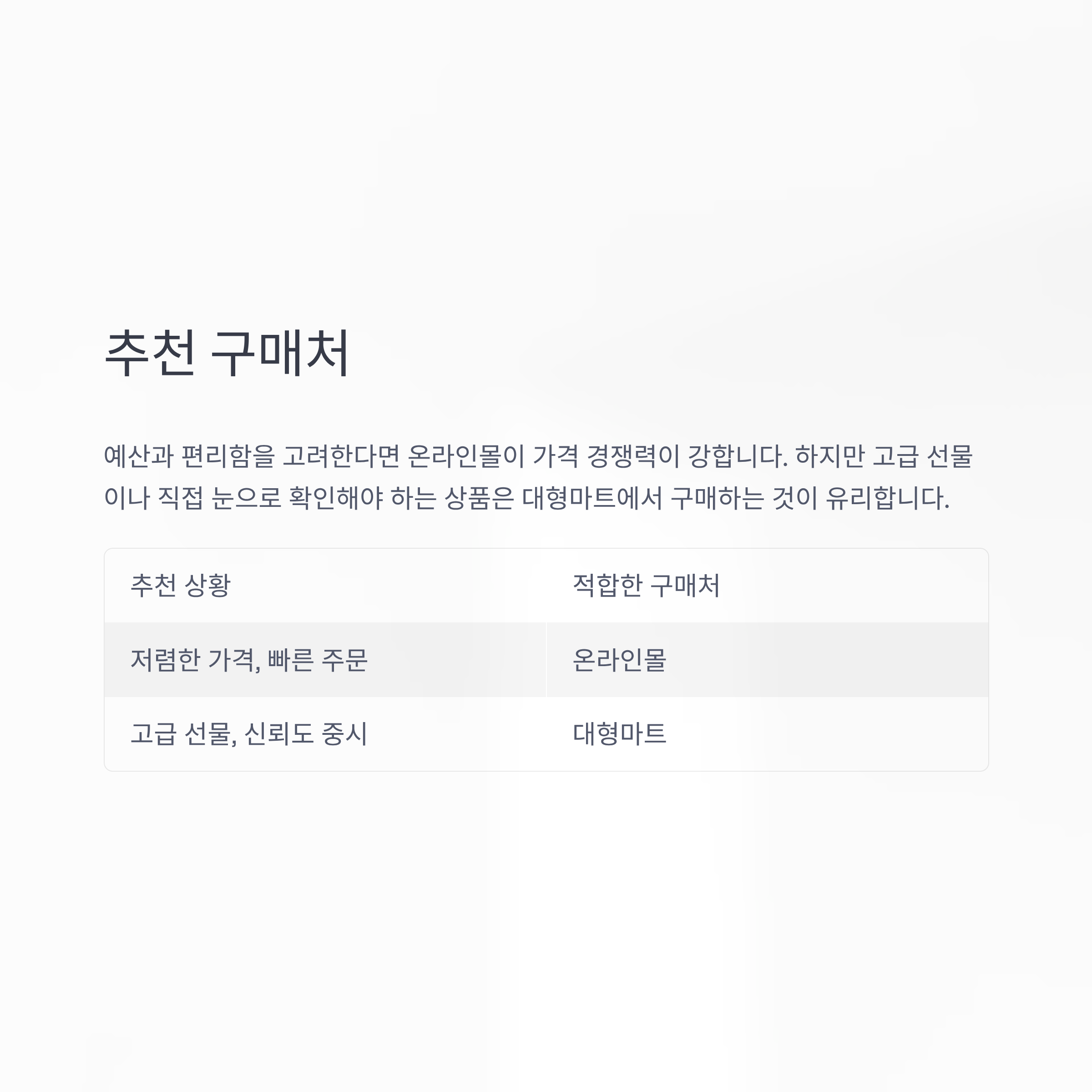 예산과 편리함을 고려한다면 온라인몰이 가격 경쟁력이 강합니다. 하지만 고급 선물이나