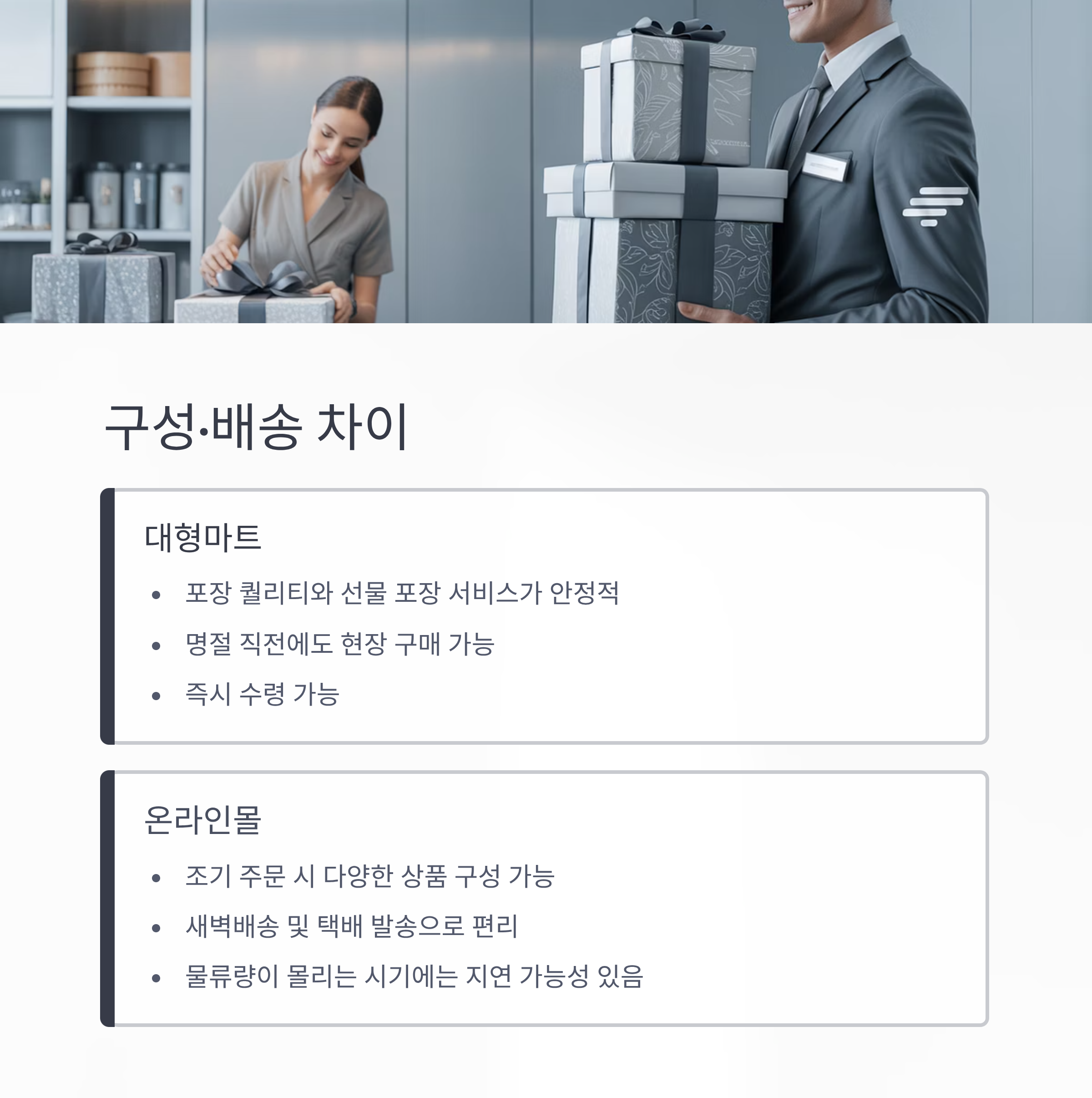 대형마트는 포장 퀄리티와 선물 포장 서비스가 안정적이며, 명절 직전에도 현장 구매가