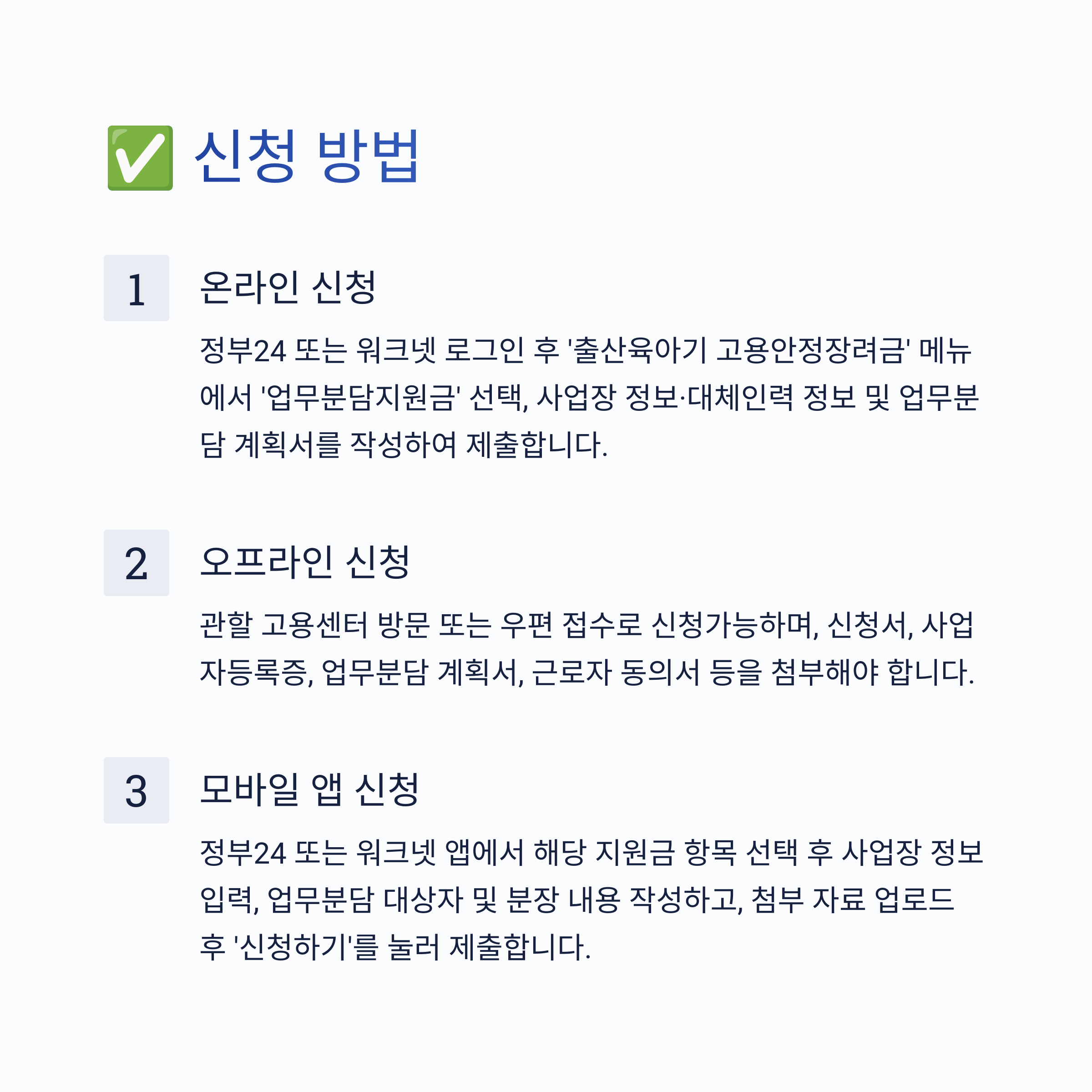 ① 온라인 신청: 정부24 또는 워크넷 로그인 후 ‘출산육아기 고용안정장려금’ 메뉴에서 ‘업무분담지원금’ 선택, 사업장 정보·대체인력 정보 및 업무분담 계획서를 작성하여 제출합니다.