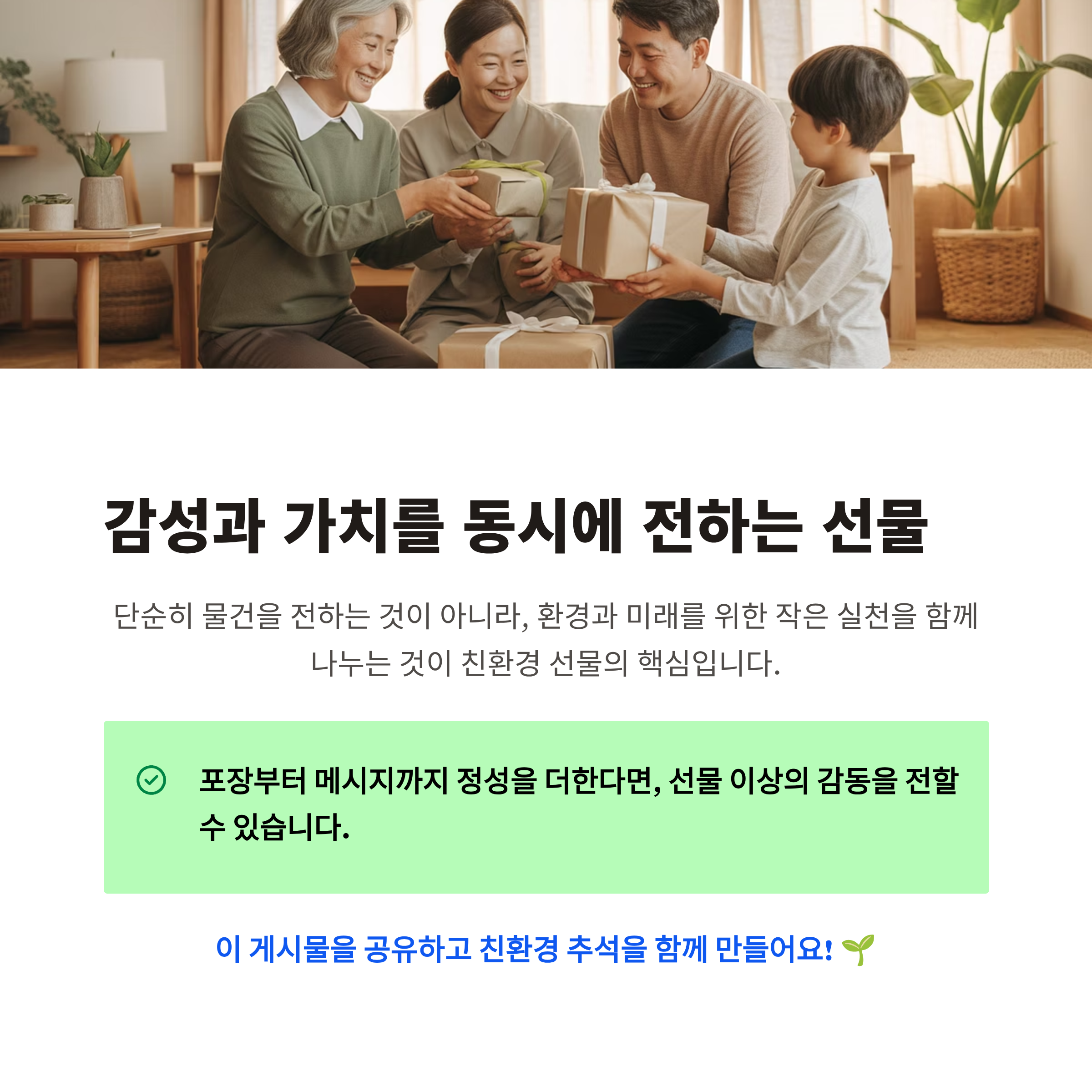 단순히 물건을 전하는 것이 아니라, 환경과 미래를 위한 작은 실천을 함께 나누는 것이 친환경 선물의 핵심입니다. 포장부터 메시지까지 정성을 더한다면, 선물 이상의 감동을 전할 수 있습니다.