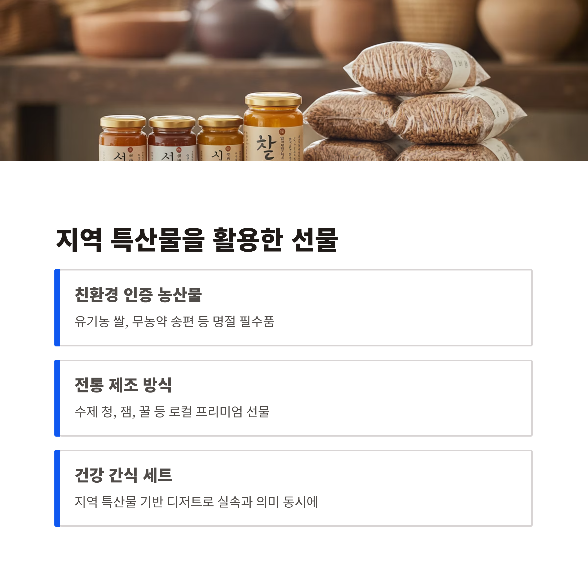 친환경 인증을 받은 지역 농산물은 선물로서도 특별한 가치를 가집니다. 유기농 쌀, 무농약 송편 같은 명절 필수품부터, 전통 제조 방식으로 만든 수제 청, 잼, 꿀 등은 로컬 프리미엄 선물로 손꼽힙니다. 지역 특산물 기반의 건강 간식이나 디저트 세트 역시 실속과 의미를 동시에 담고 있습니다.