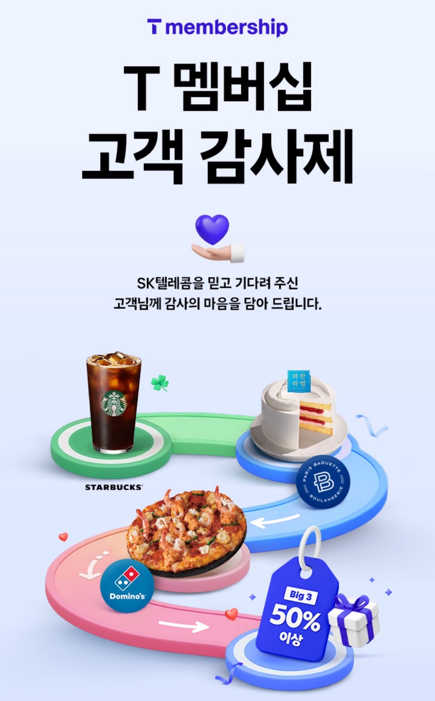 T멤버십 앱 실행 후 고객 감사제 메뉴에 들어가면 ‘파리바게뜨 50% 할인’ 쿠폰을 받을 수 있습니다.