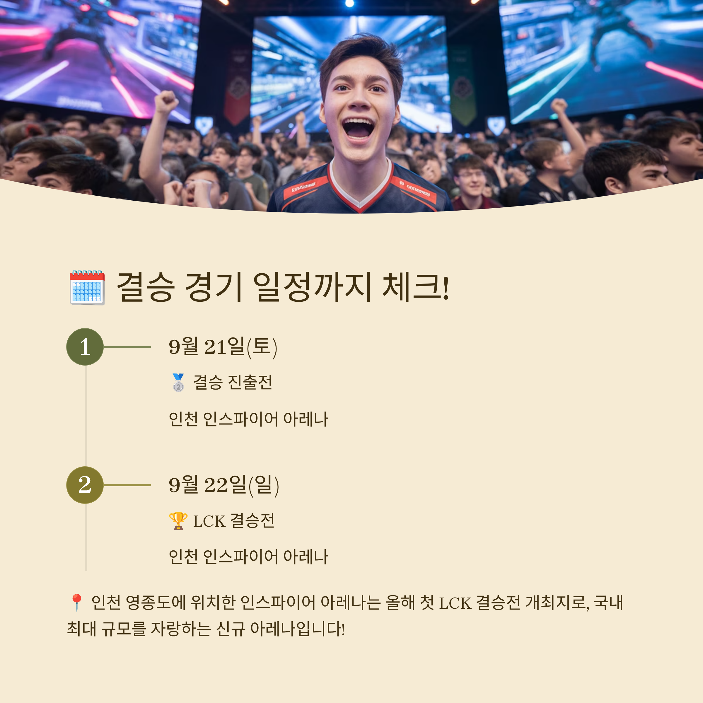 | 9월 22일(일) | 🏆 LCK 결승전 | 인천 인스파이어 아레나 |