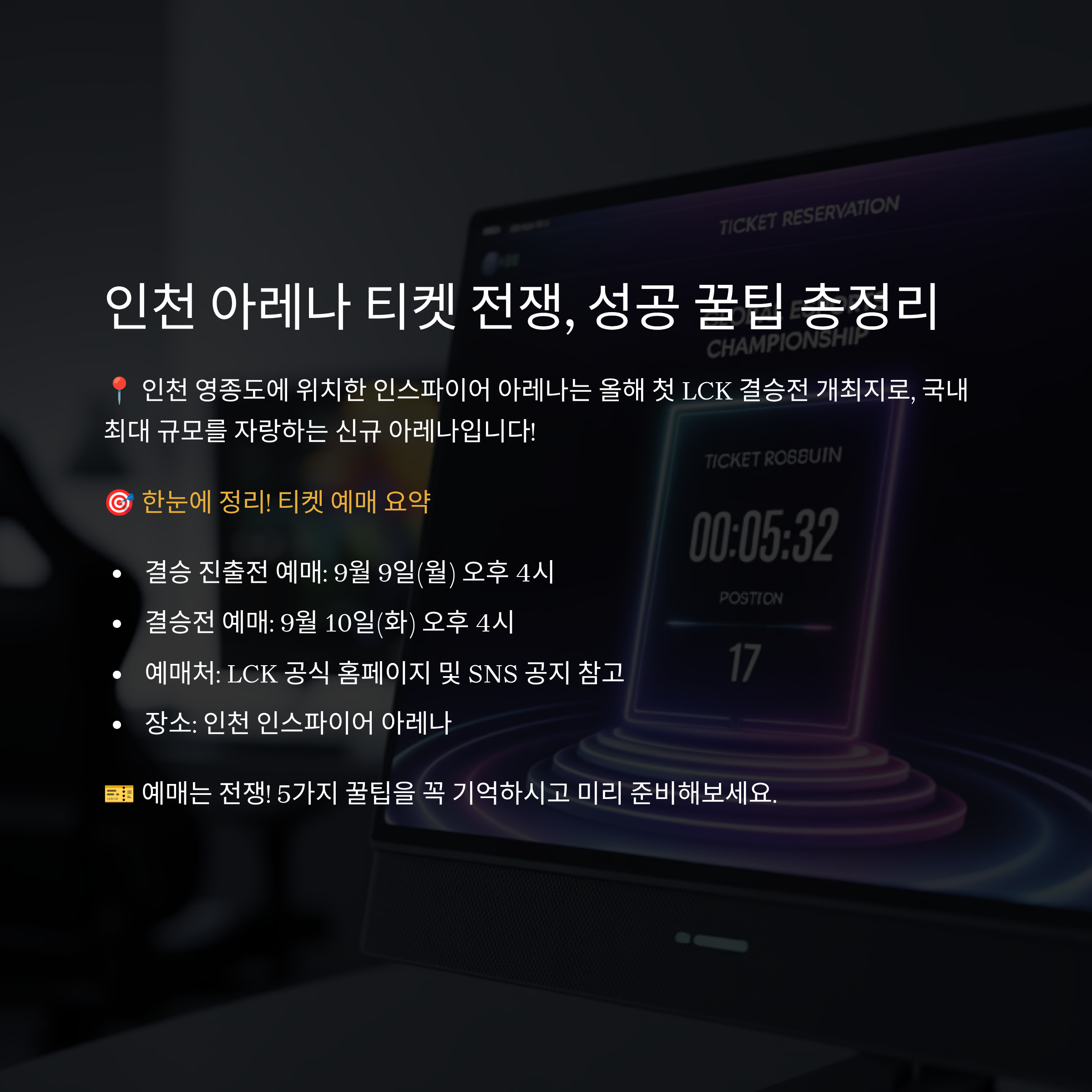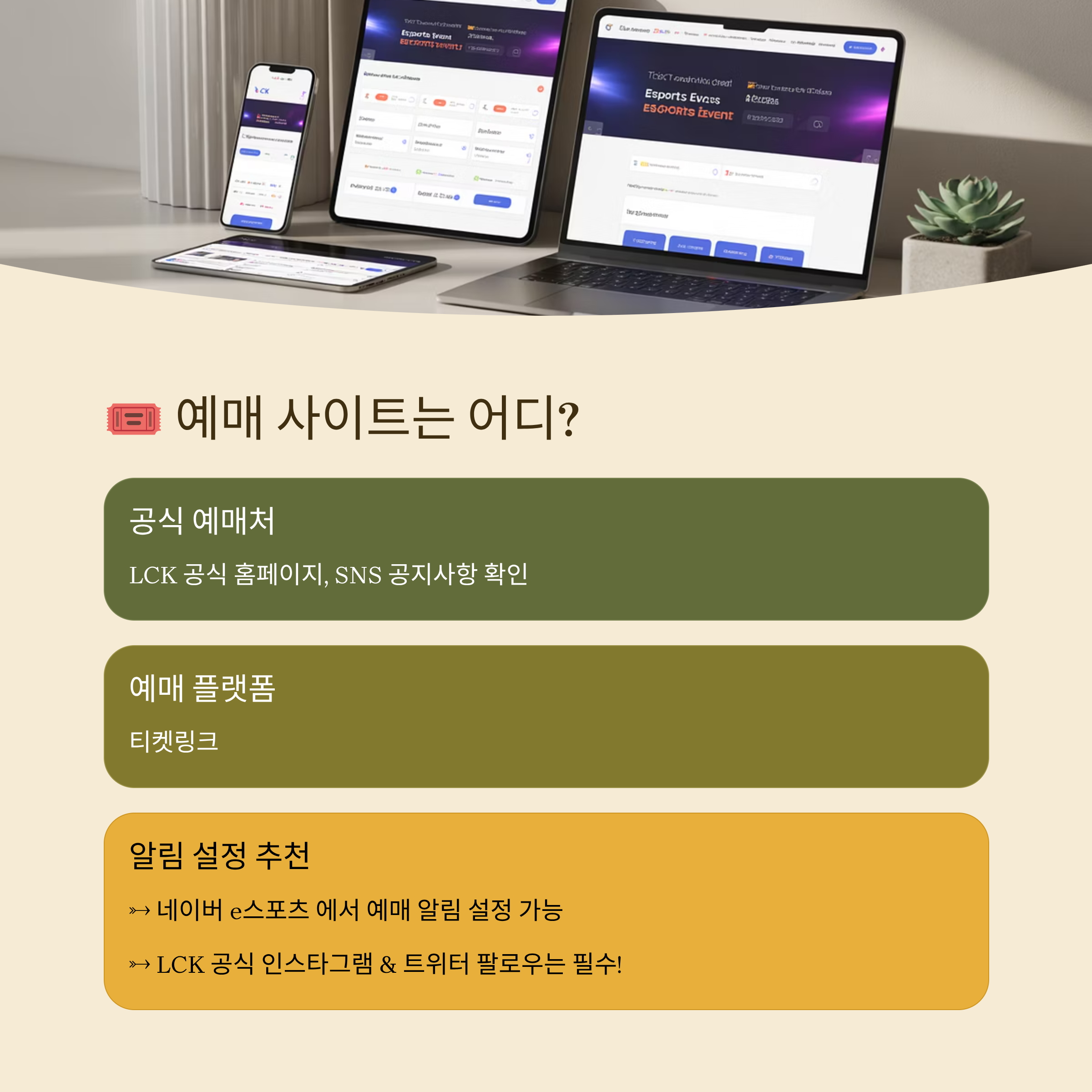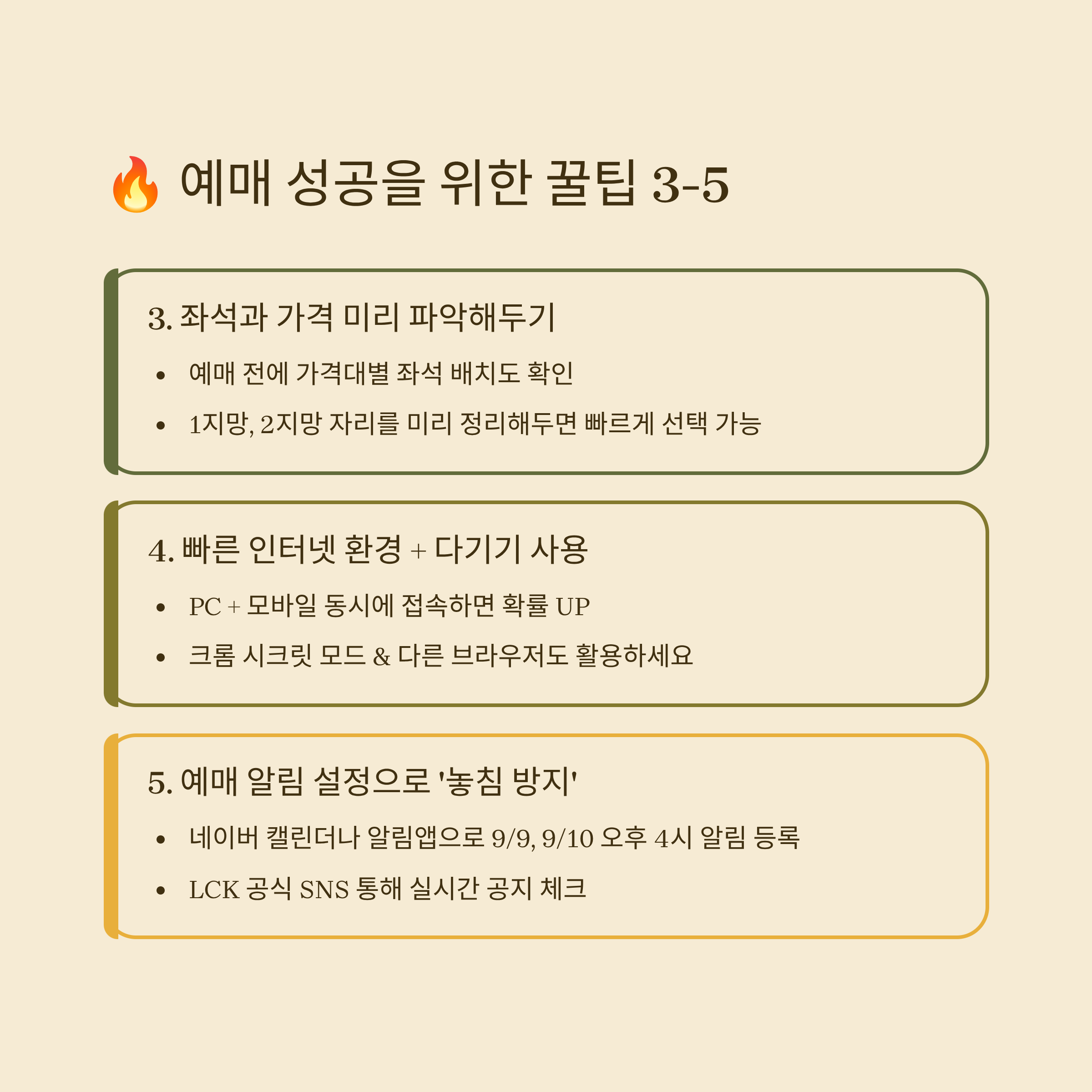- 공식 예매처: LCK 공식 홈페이지, SNS 공지사항 확인