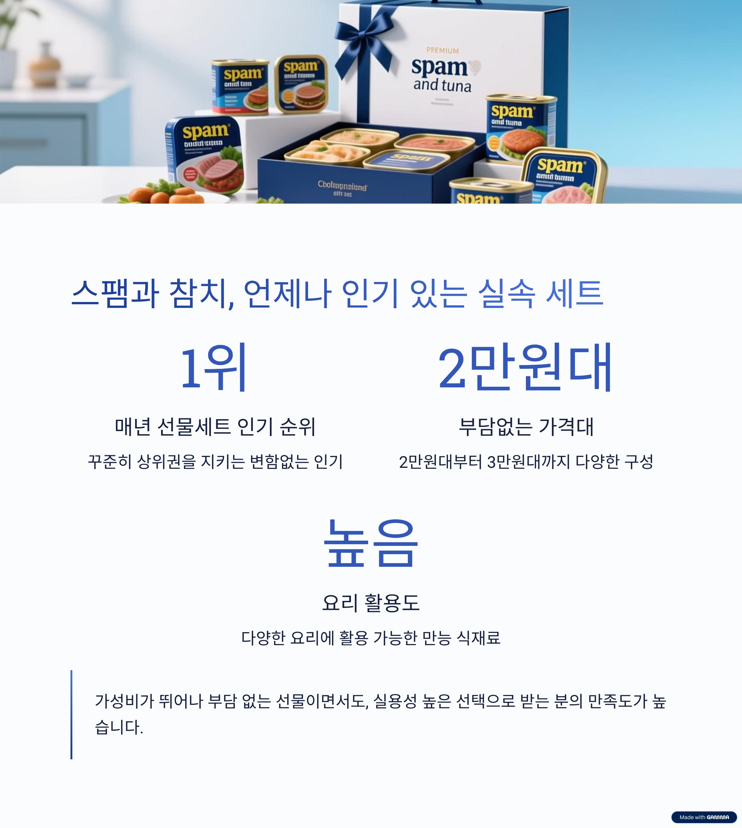 스팸과 참치는 요리에 활용도가 높아 매년 선물세트 인기 순위 상위권을 지키고 있습니다. 2만원대부터 3만원대까지 다양한 구성으로 선택 가능하며, 가성비가 뛰어나 부담 없는 선물입니다.