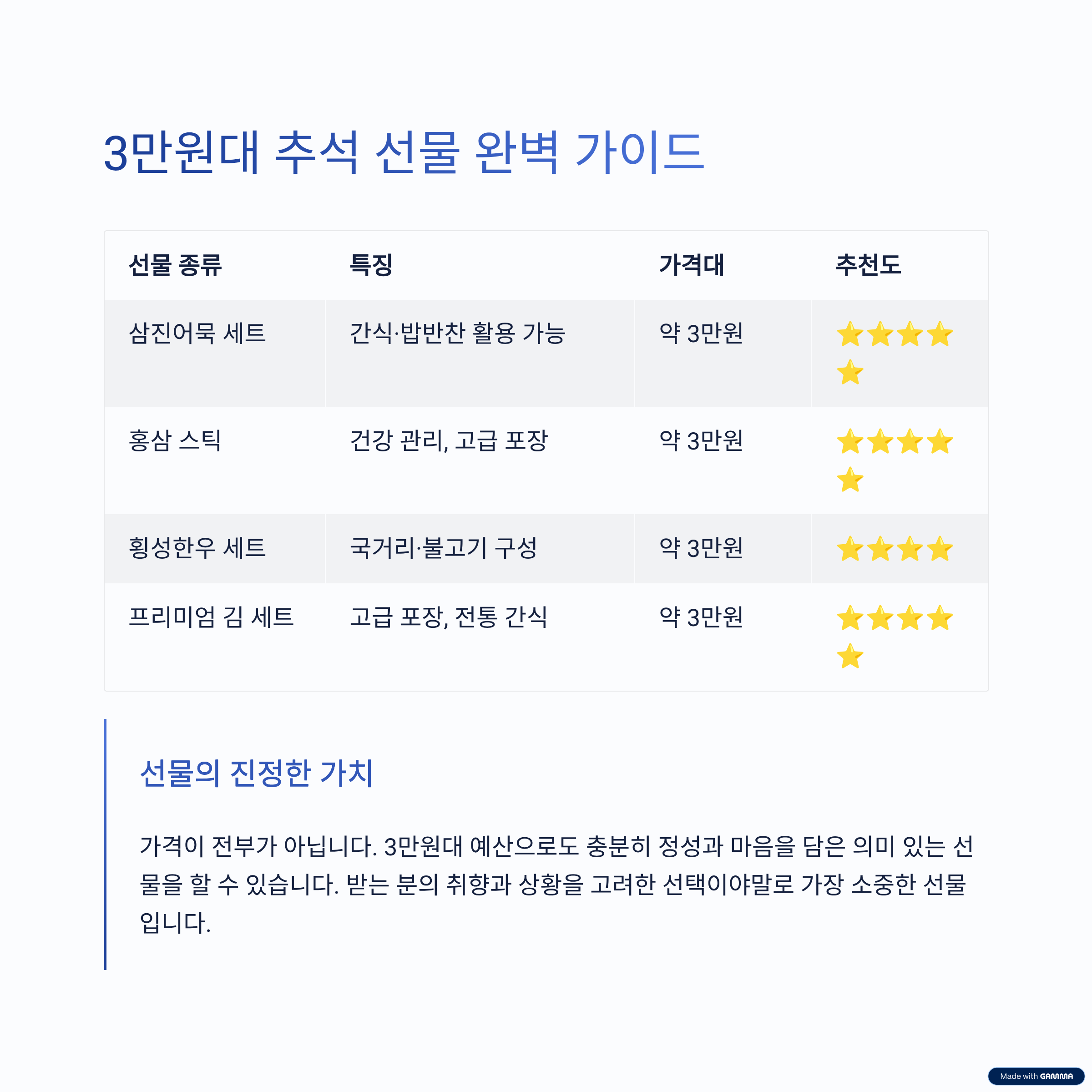 추석 선물은 받는 사람의 마음을 생각하면서도 예산을 고려해야 하는 현실적인 고민이 따릅니다. 3만원대 예산이라면 가격 부담은 줄이면서도 충분히 고급스럽고 실속 있는 선택이 가능합니다. 이번 글에서는 건강식품, 전통 간식, 실속 있는 생활 식품 등 다양한 카테고리에서 3만원대 추석 선물세트를 소개해 드리겠습니다.
