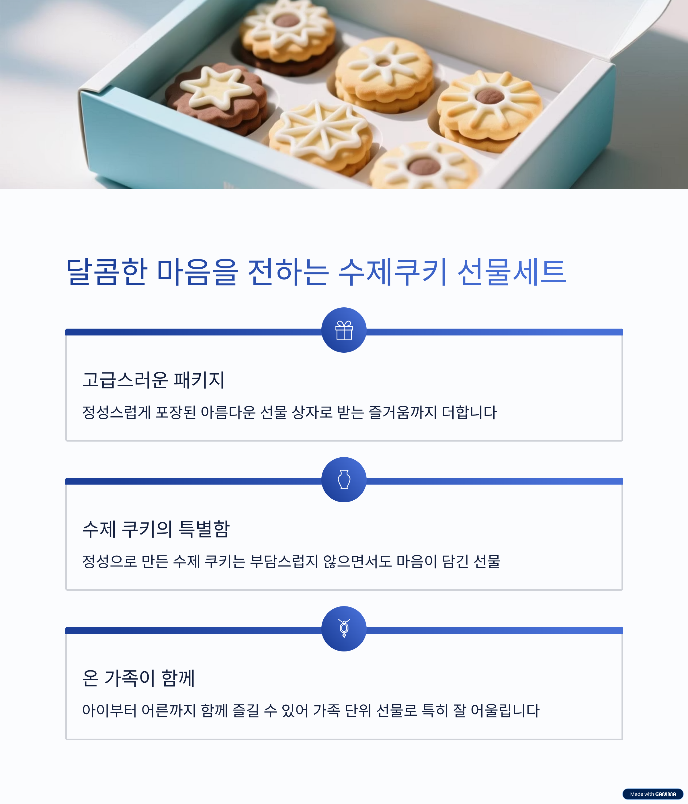 고급스러운 패키지에 담긴 수제 쿠키는 부담스럽지 않으면서도 정성을 담은 선물로 제격입니다. 아이부터 어른까지 함께 즐길 수 있어 가족 단위 선물로 특히 잘 어울립니다.
