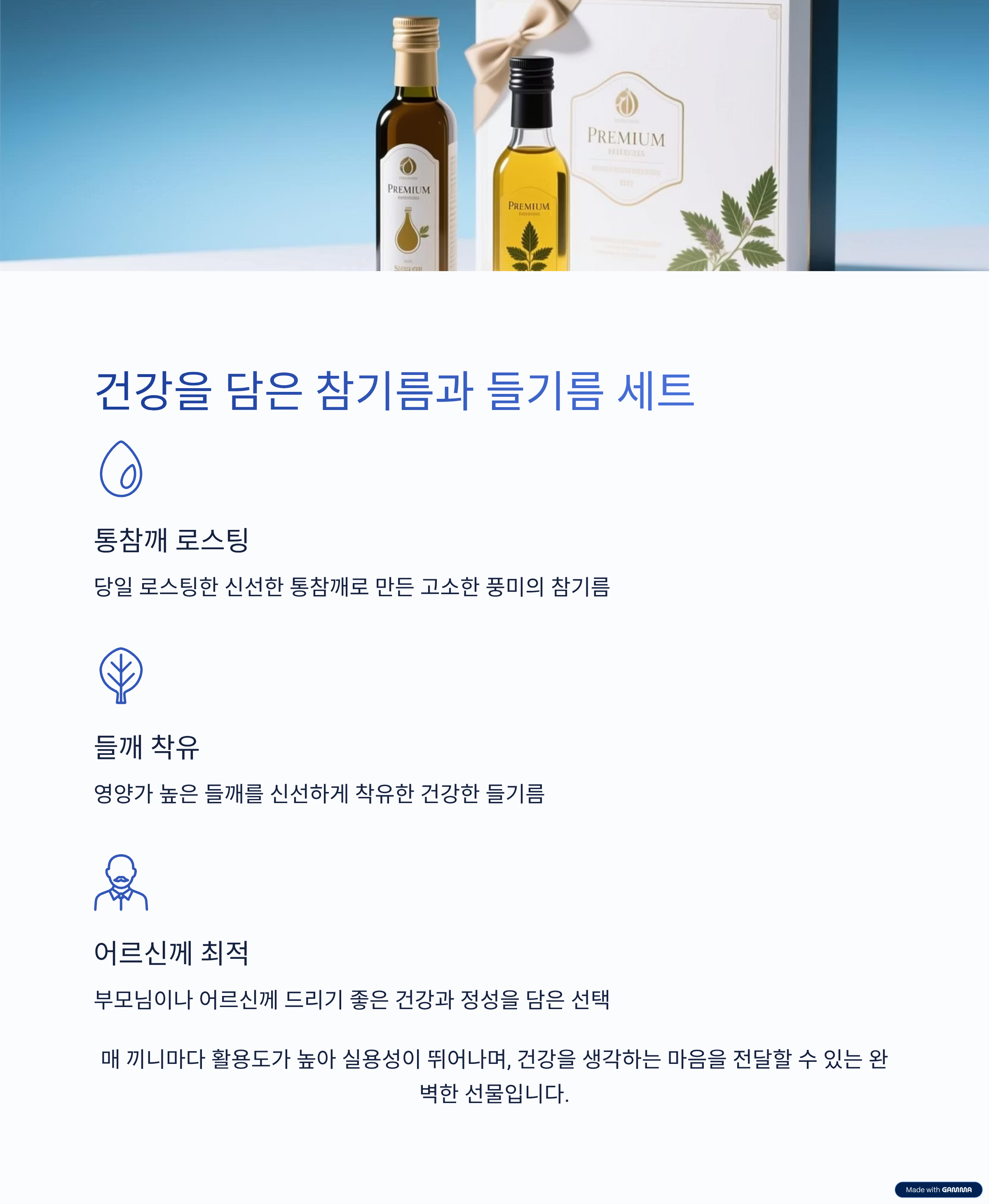 통참깨와 들깨를 당일 로스팅 후 착유한 참기름·들기름 세트는 고소한 풍미와 건강을 동시에 선물할 수 있습니다. 부모님이나 어르신께 드리기 좋은 선택으로, 매 끼니마다 활용도가 높아 실용성이 뛰어납니다.