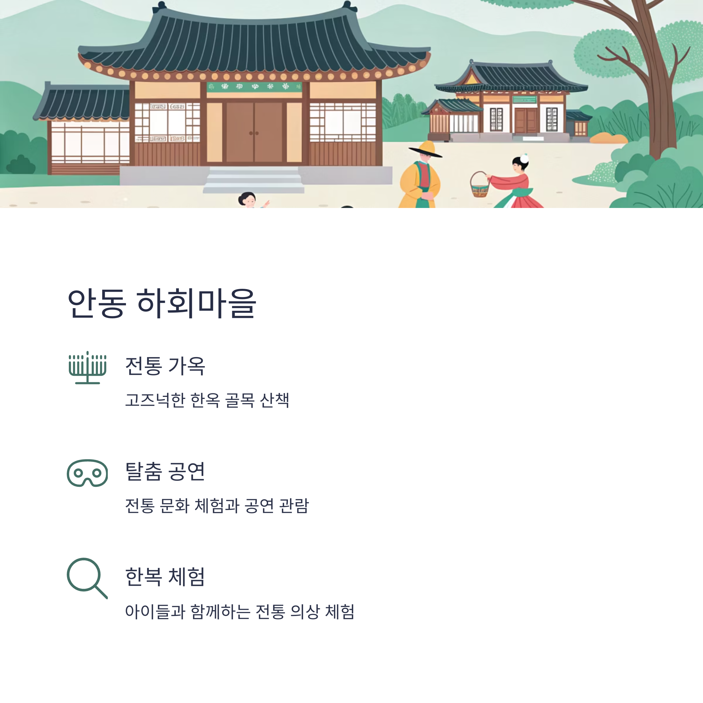 전통 가옥과 한복 체험, 탈춤 공연 관람이 가능한 하회마을은
