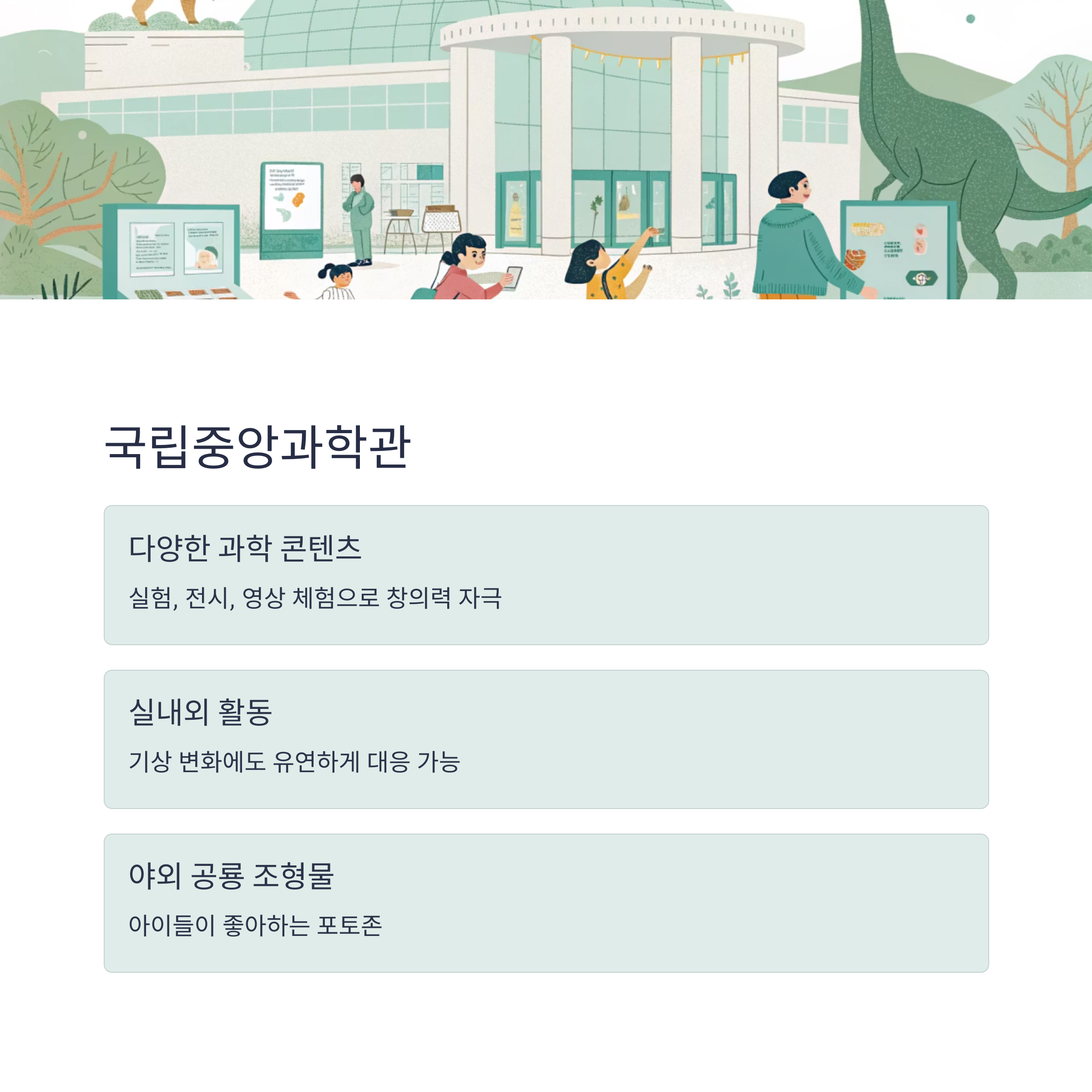 | 야외 공간 | 공룡 조형물, 기계체험 | 포토존 풍부 |