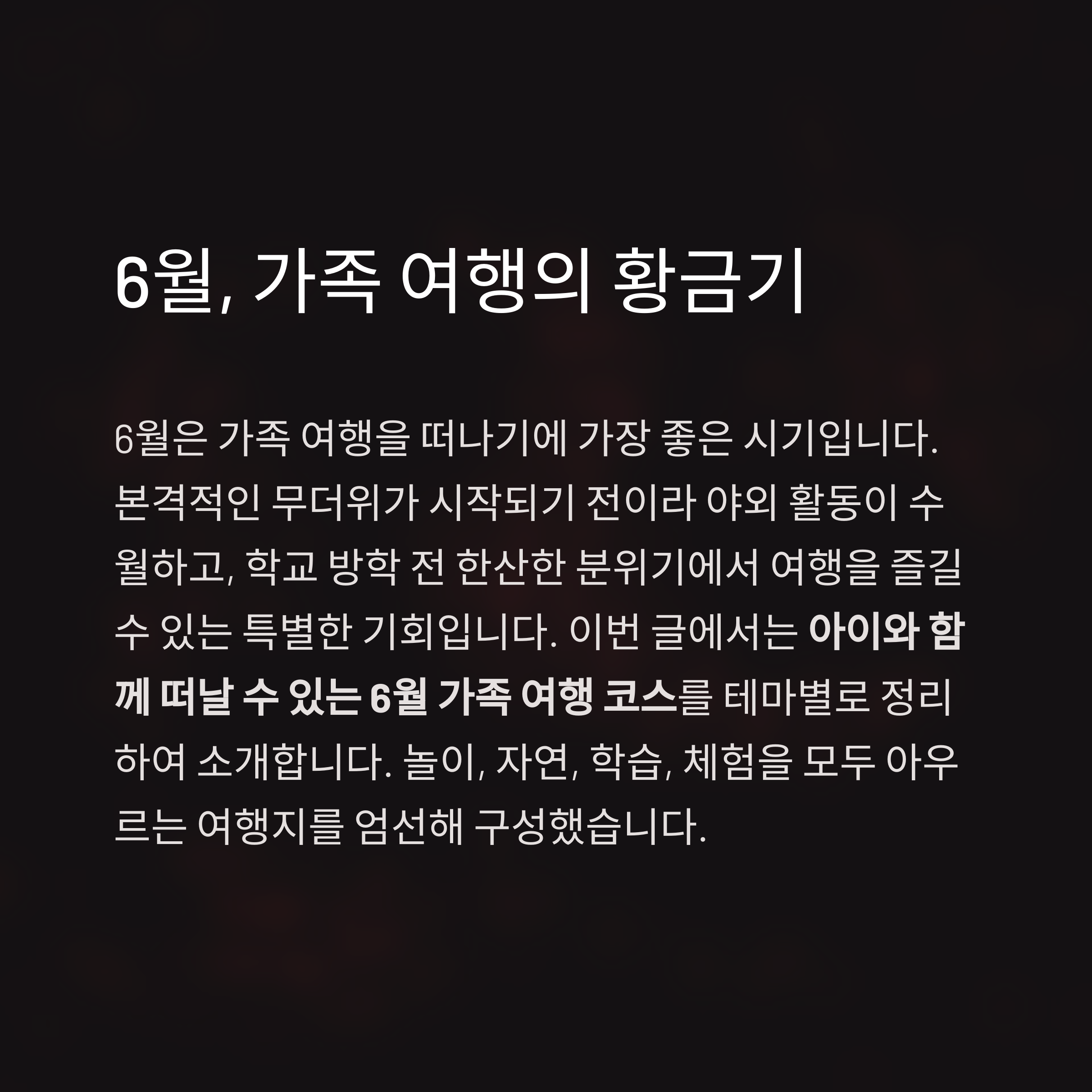 이번 글에서는 아이와 함께 떠날 수 있는 6월 가족 여행 코스를 테마별로 정리하여 소개합니다.