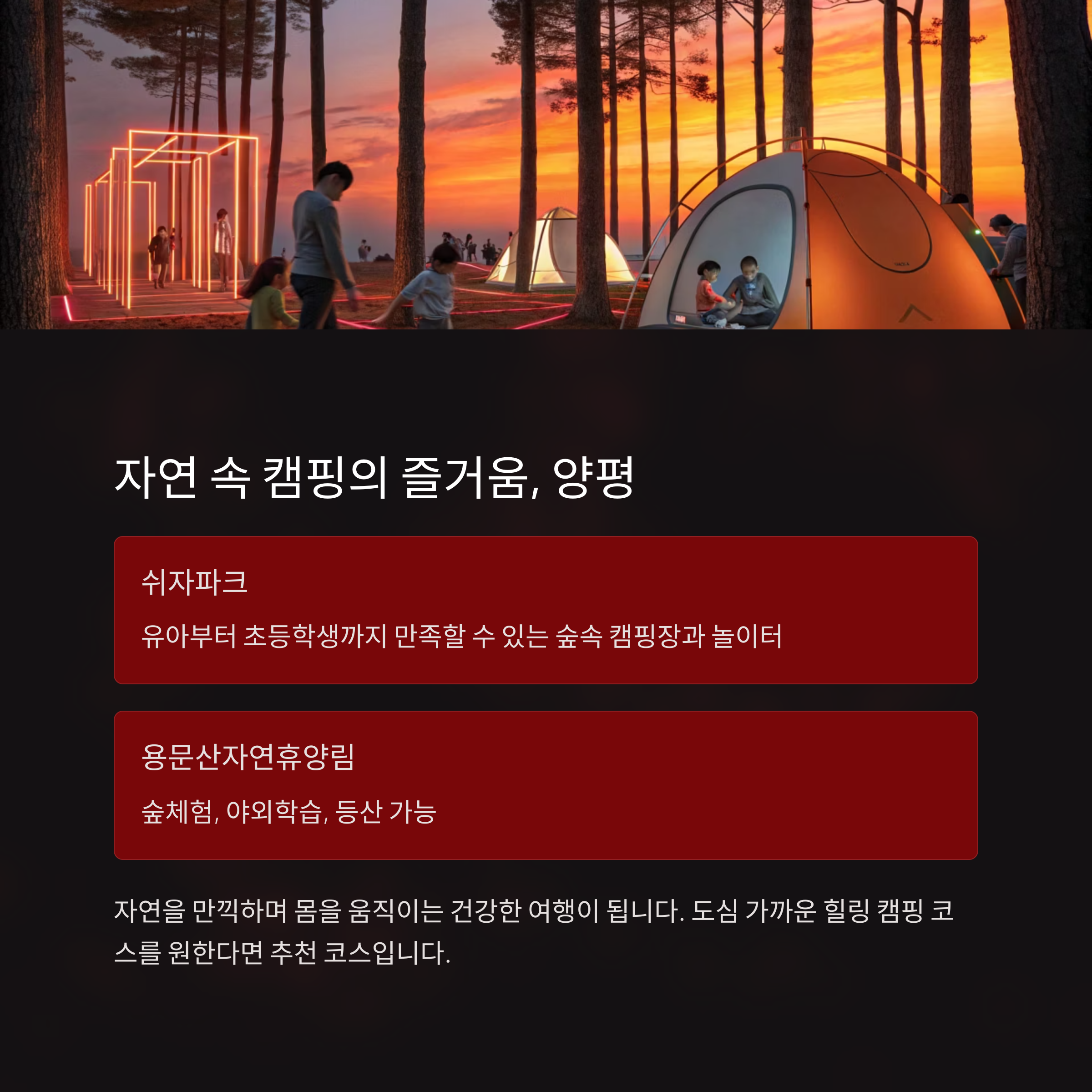 | 캠핑놀이 | 양평 | 숲속체험, 휴양림 |