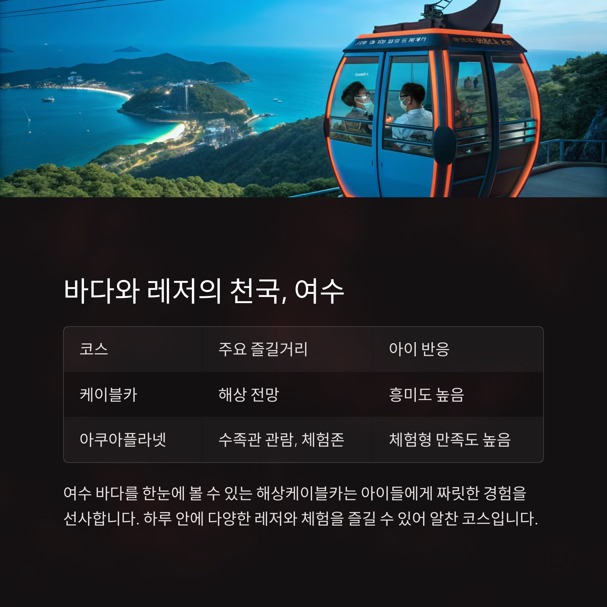 여수 바다를 한눈에 볼 수 있는 해상케이블카는 아이들에게 짜릿한 경험을 선사합니다.
