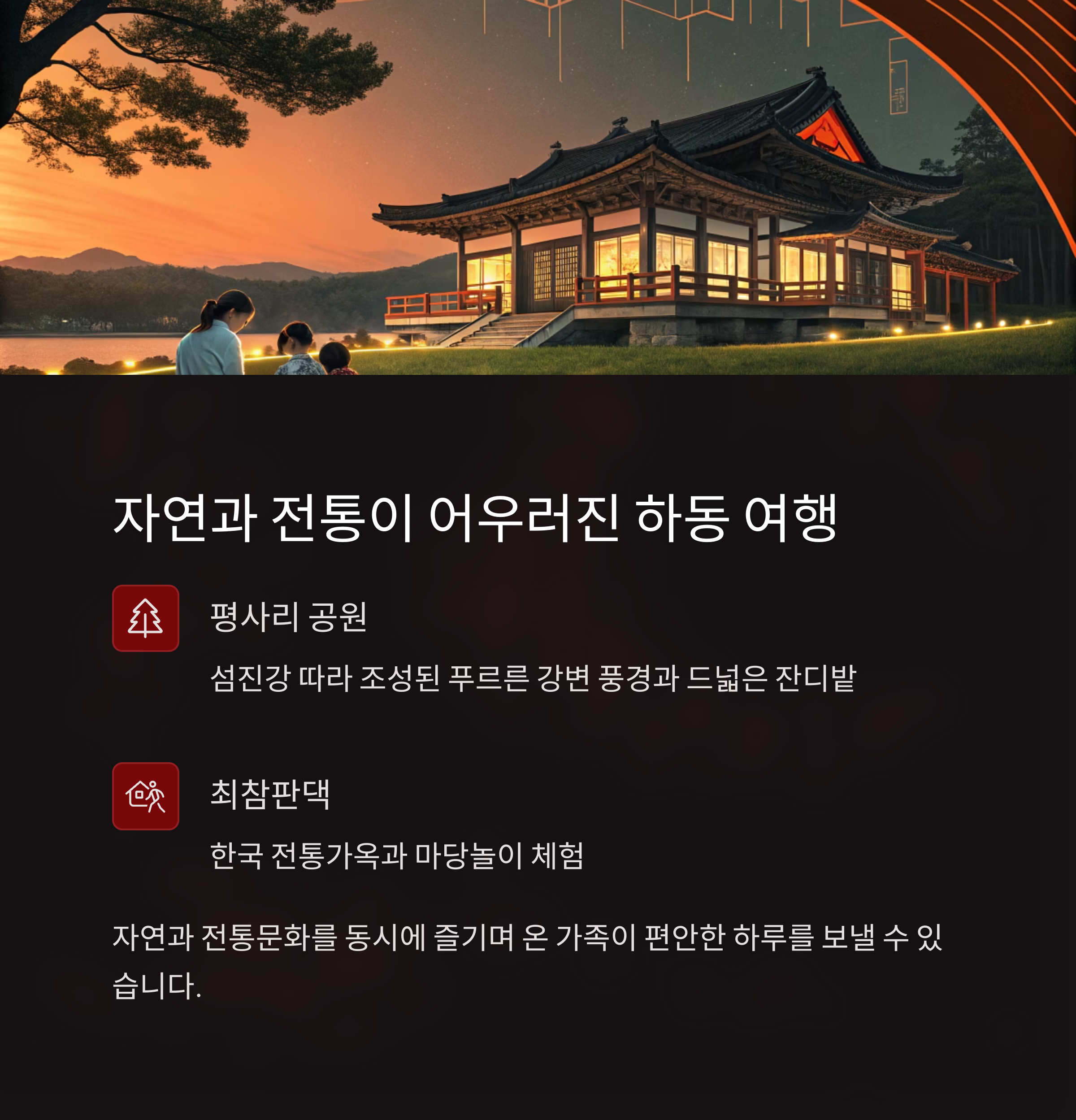 자연과 전통문화를 동시에 즐기며 온 가족이 편안한 하루를 보낼 수 있습니다.