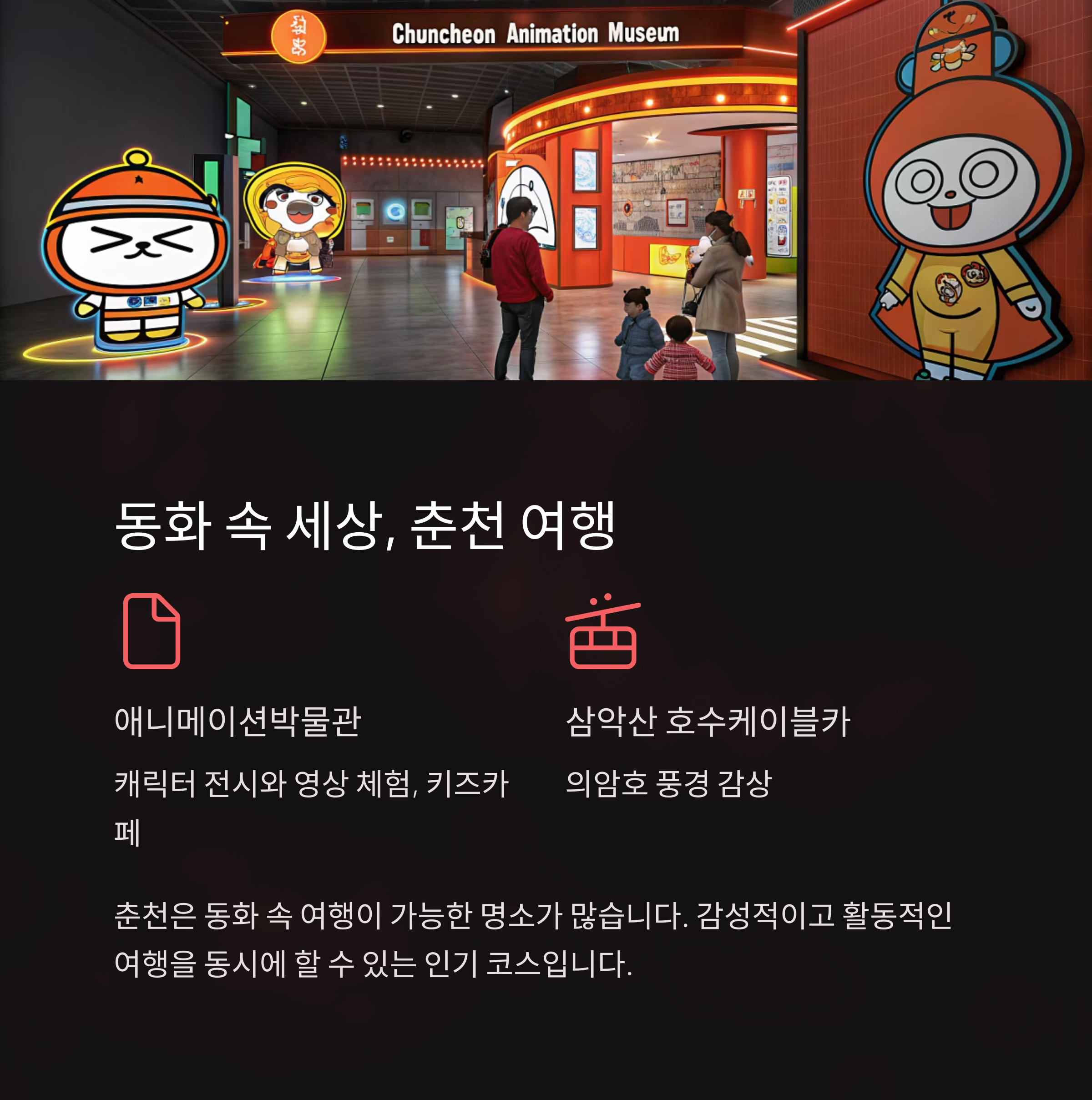 | 동화체험 | 춘천 | 애니메이션, 케이블카 |