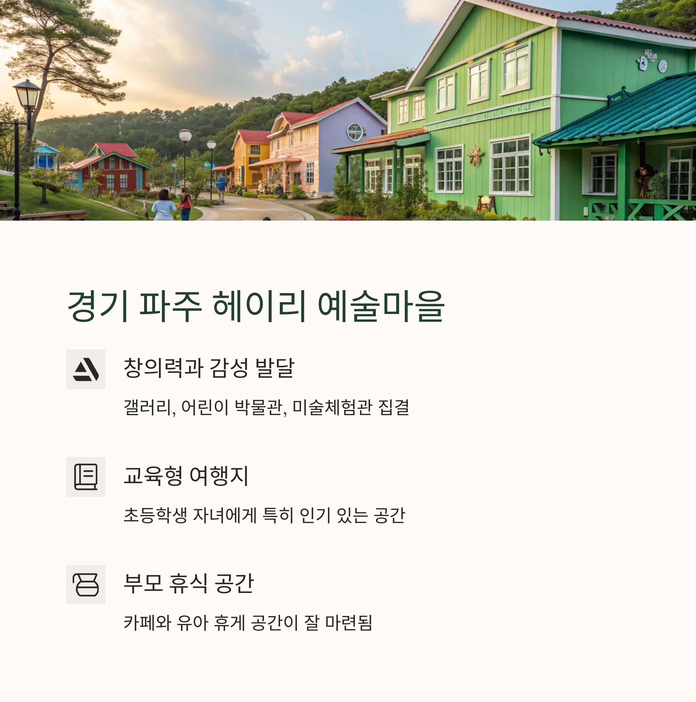 | 경기 파주 | 헤이리 & 영어마을 | 창의체험 + 교육 콘텐츠 중심 | 우수 |