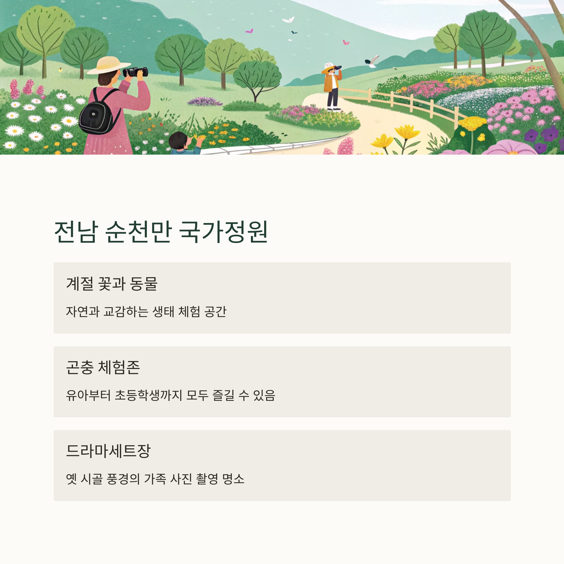 | 전남 순천 | 국가정원 & 드라마세트장 | 생태체험 + 문화테마공간 | 양호 |