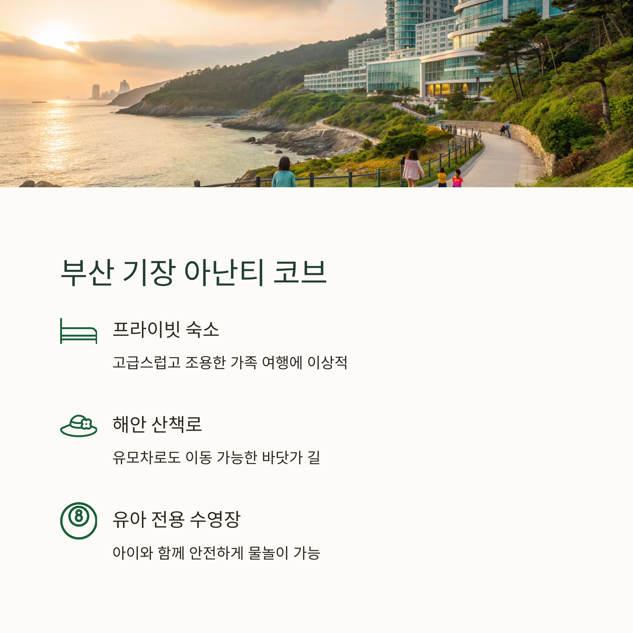 | 부산 기장 | 아난티 코브 & 해변길 | 프라이버시형 휴양 + 산책로 | 매우 우수 |