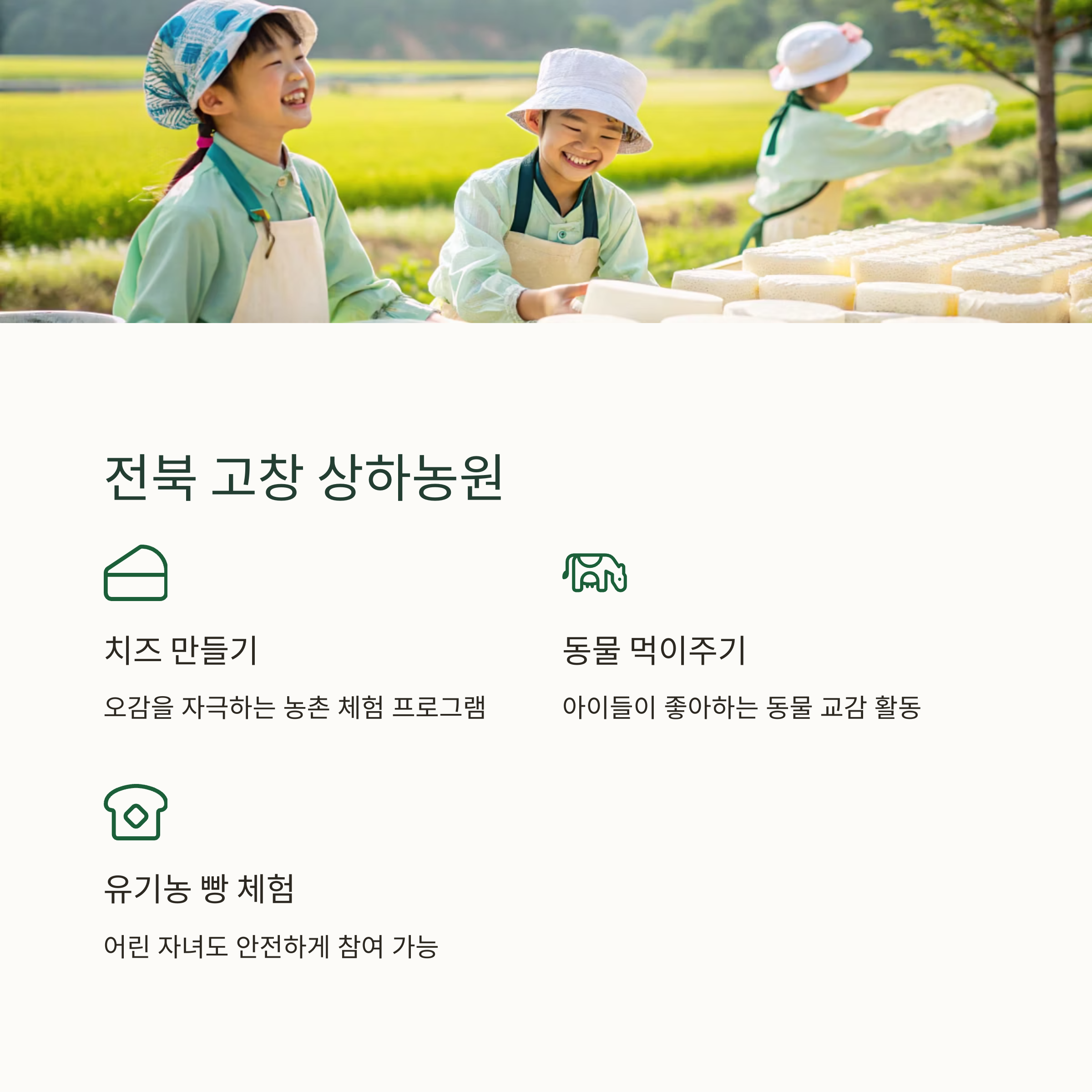 | 전북 고창 | 상하농원 & 고인돌유적지 | 체험형 + 역사탐방 결합 | 양호 |
