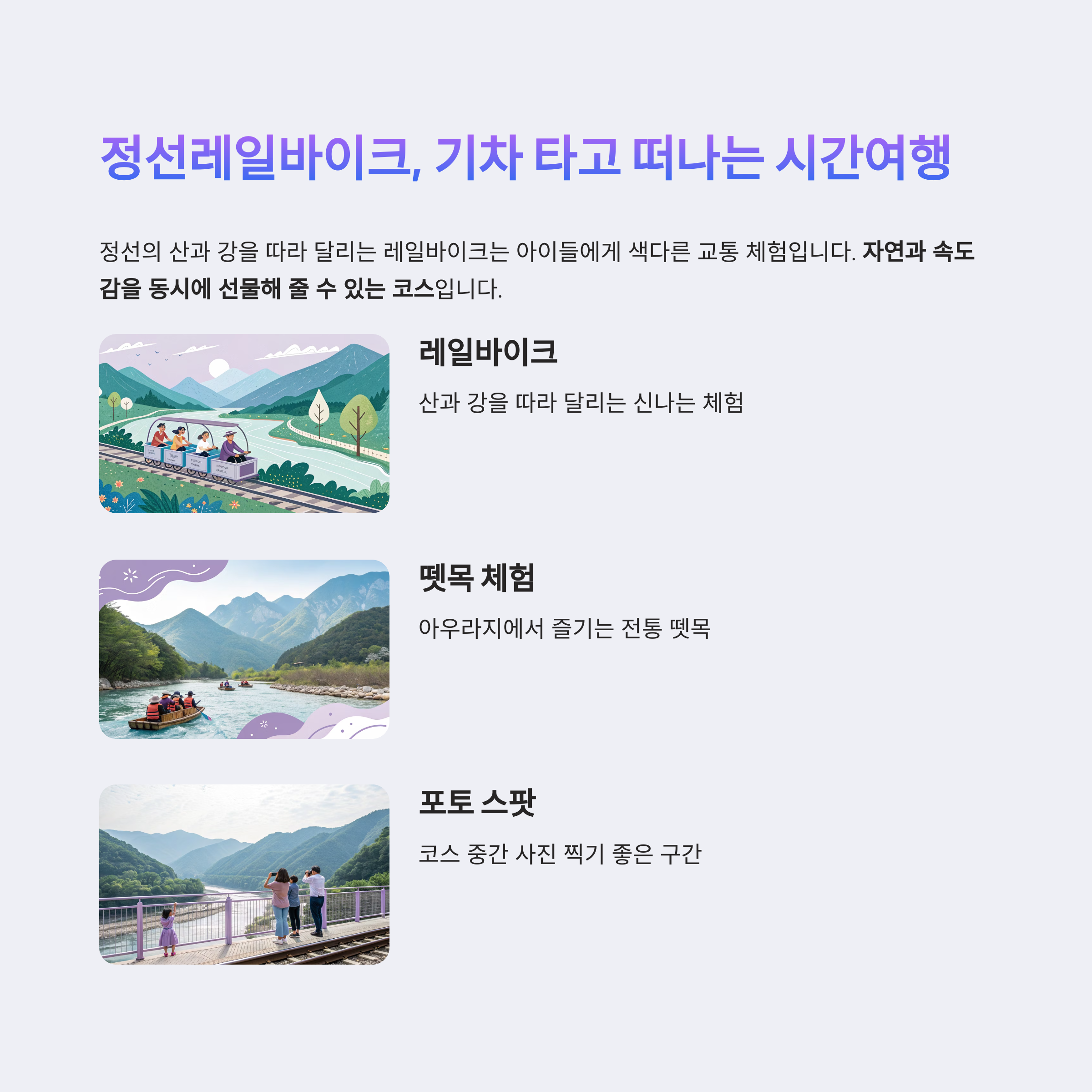 정선의 산과 강을 따라 달리는 레일바이크는 아이들에게 놀이처럼 느껴지는 색다른 교통 체험입니다.