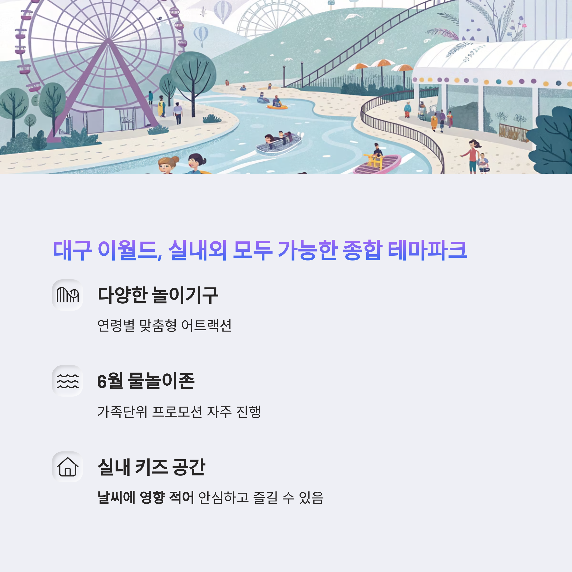 이월드는 다양한 놀이기구와 실내 키즈 공간이 함께 마련된 종합 테마파크입니다.