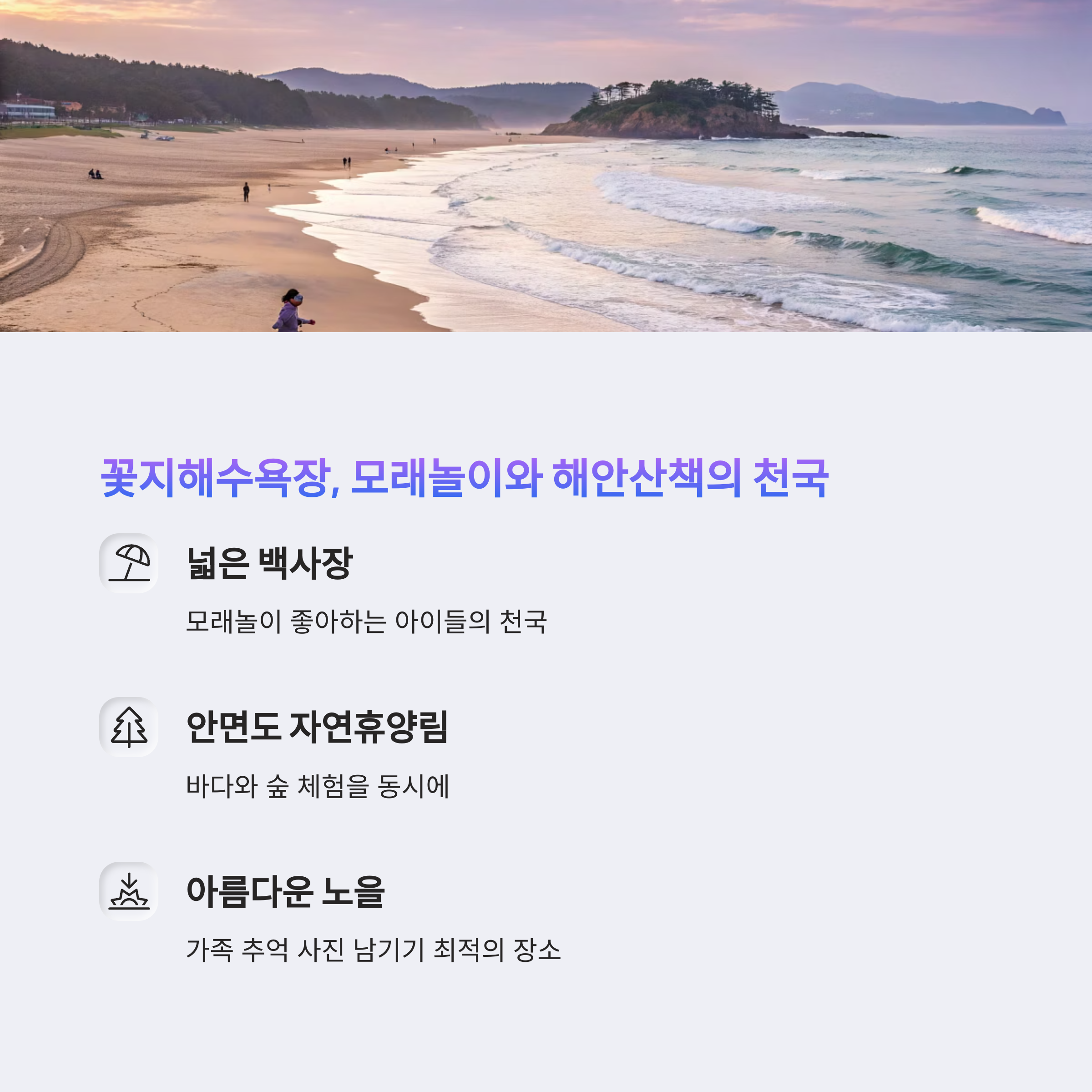 근처 ‘안면도 자연휴양림’과 연계하면 바다와 숲 체험을 동시에 할 수 있으며,