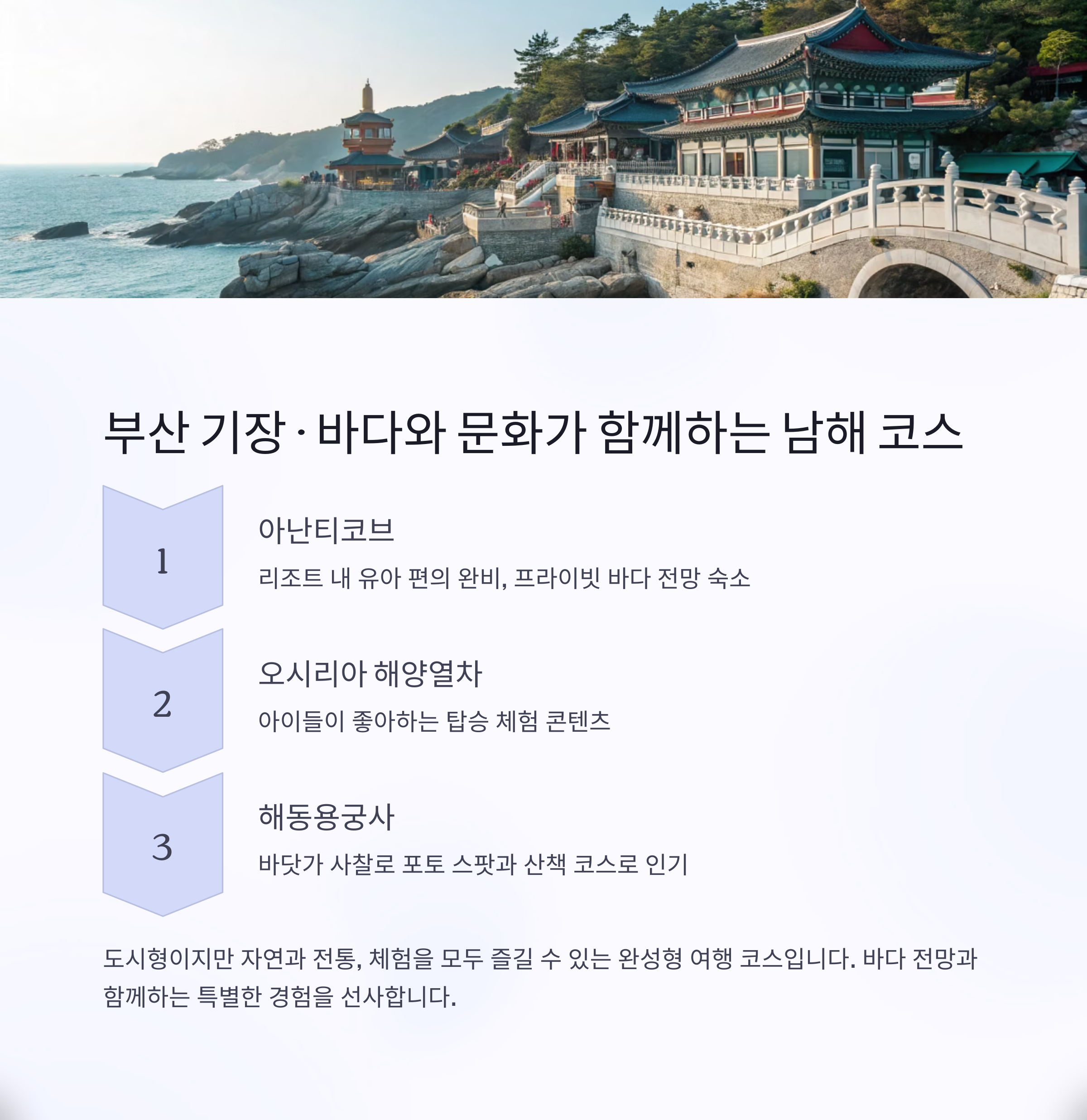 | 부산 기장 | 아난티코브 + 해양열차 + 용궁사 | 프라이버시+탑승+전통 | 전 연령대 |