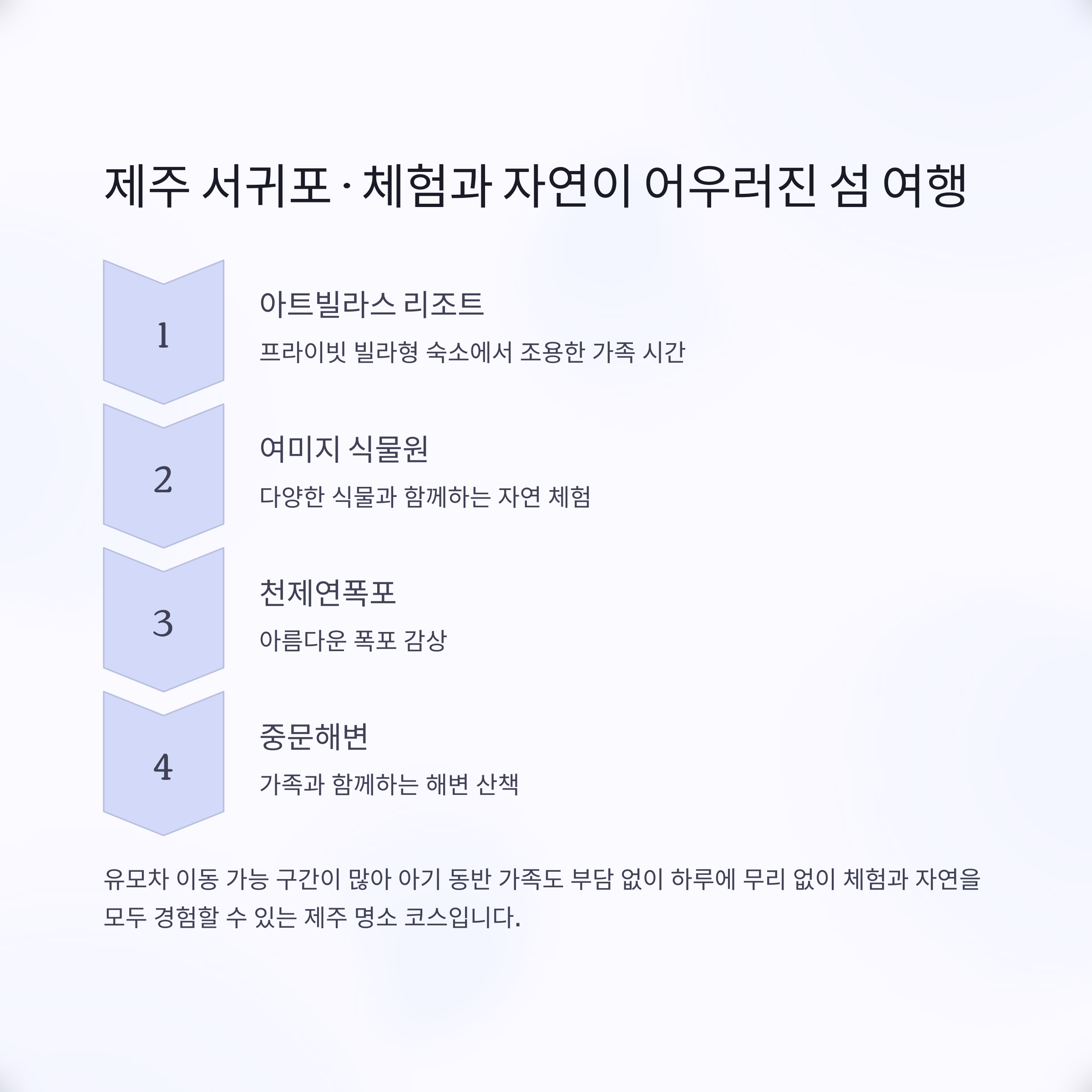| 제주 서귀포 | 아트빌라스 + 식물원 + 폭포 + 해변 | 자연+체험+휴식 조화 | 유아~초등 |