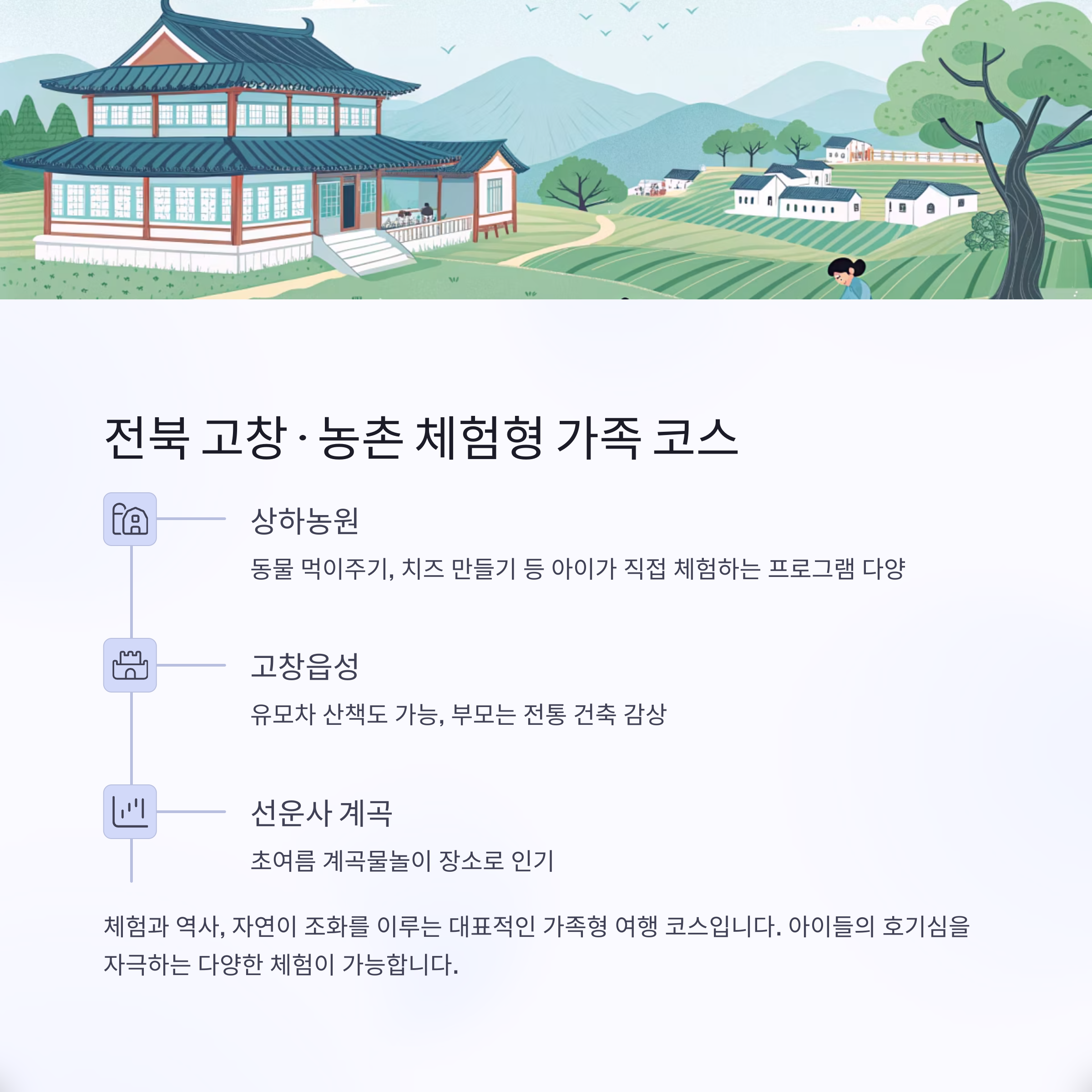 | 전북 고창 | 상하농원 + 읍성 + 선운사계곡 | 농촌 체험+역사+자연 | 유아~초등 |