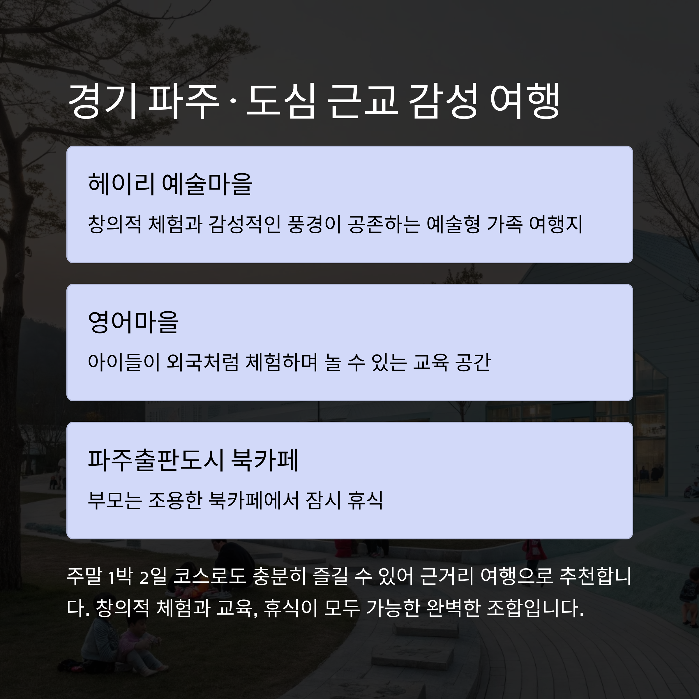 | 경기 파주 | 헤이리 + 영어마을 + 북카페 | 감성+교육형 도심 근교 여행 | 초등 이상 |