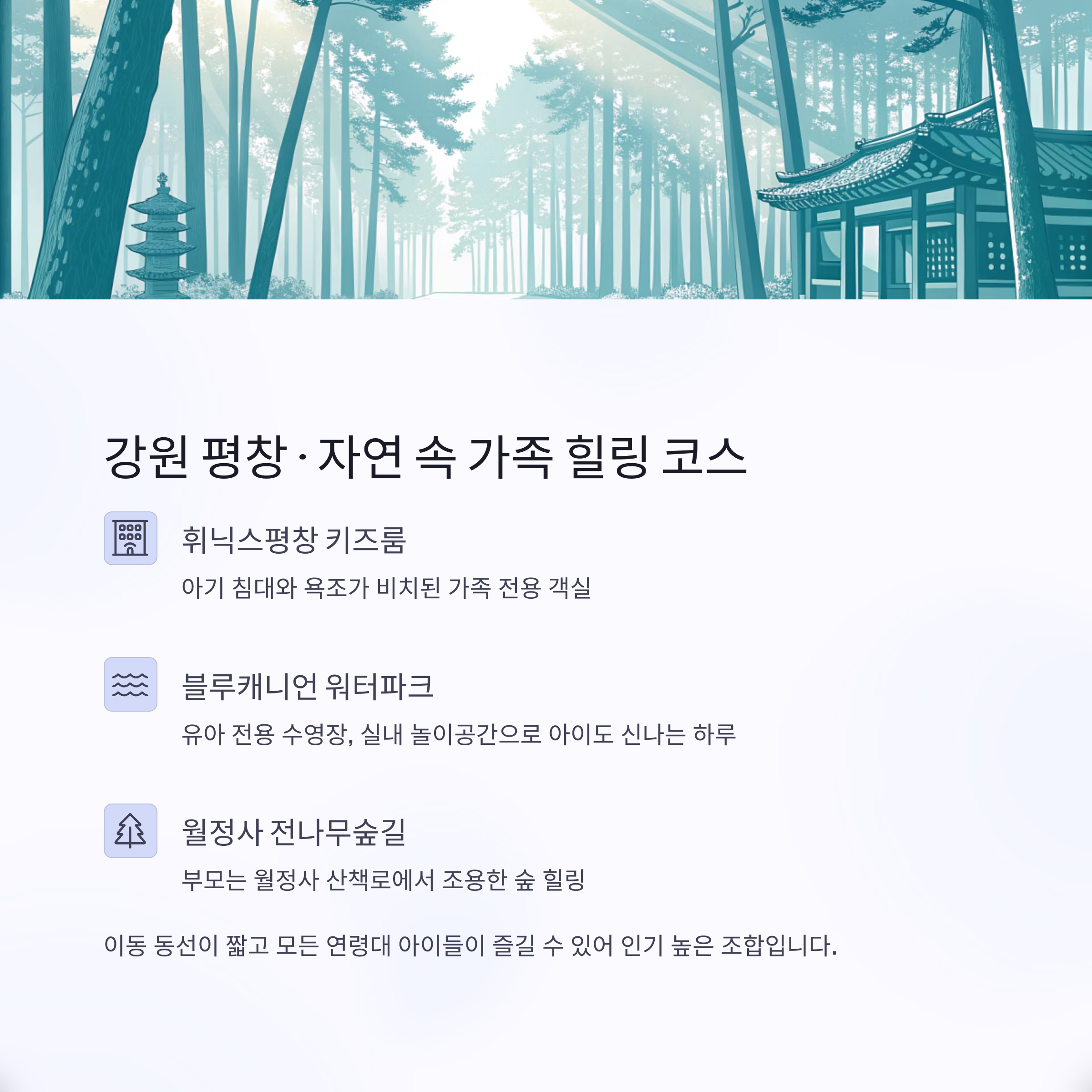 | 강원 평창 | 휘닉스키즈룸 + 블루캐니언 + 전나무숲길 | 워터파크+숲 힐링 | 전 연령대 |
