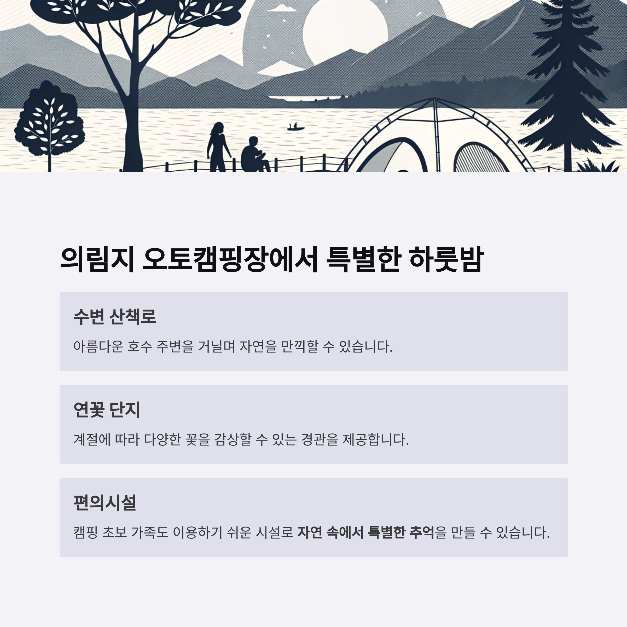 수변 산책로와 연꽃 단지, 체험형 오토캠핑장이 잘 어우러져 있습니다.