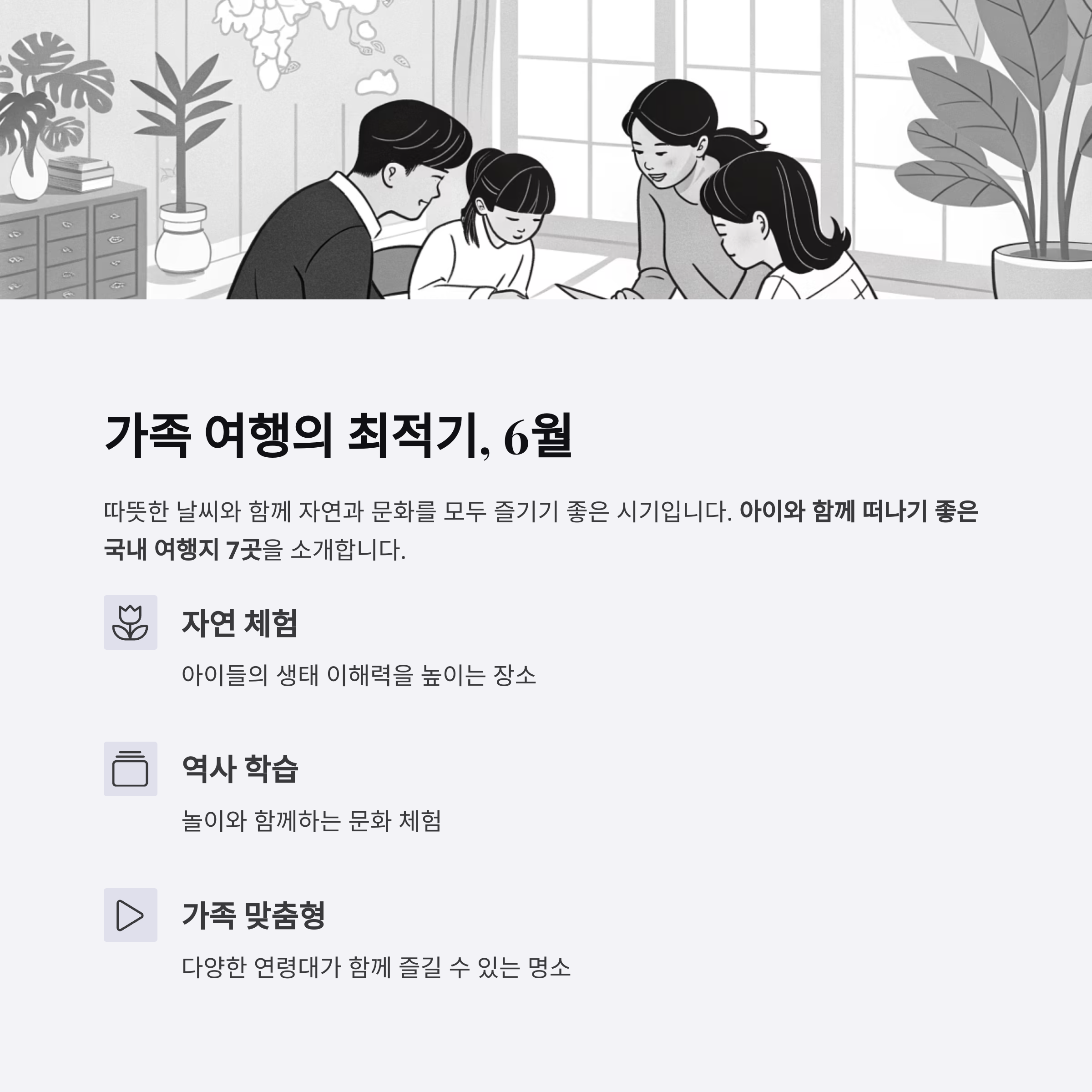 가족 여행을 계획하는 6월은 따뜻한 날씨와 함께 자연과 문화를 모두 즐기기 좋은 시기입니다.