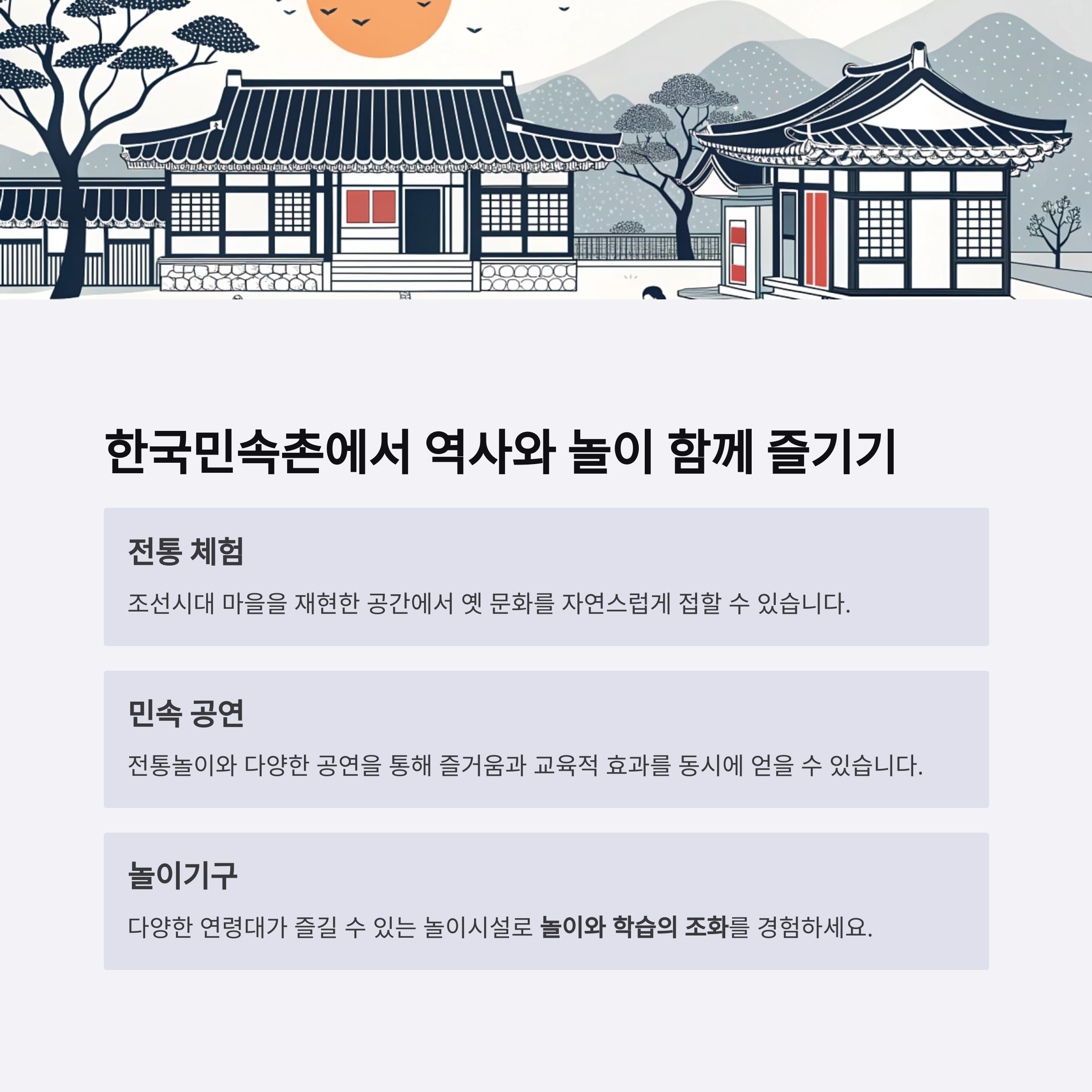 실제 조선시대 마을을 재현한 한국민속촌은 역사 체험과 즐길 거리를 동시에 제공합니다.