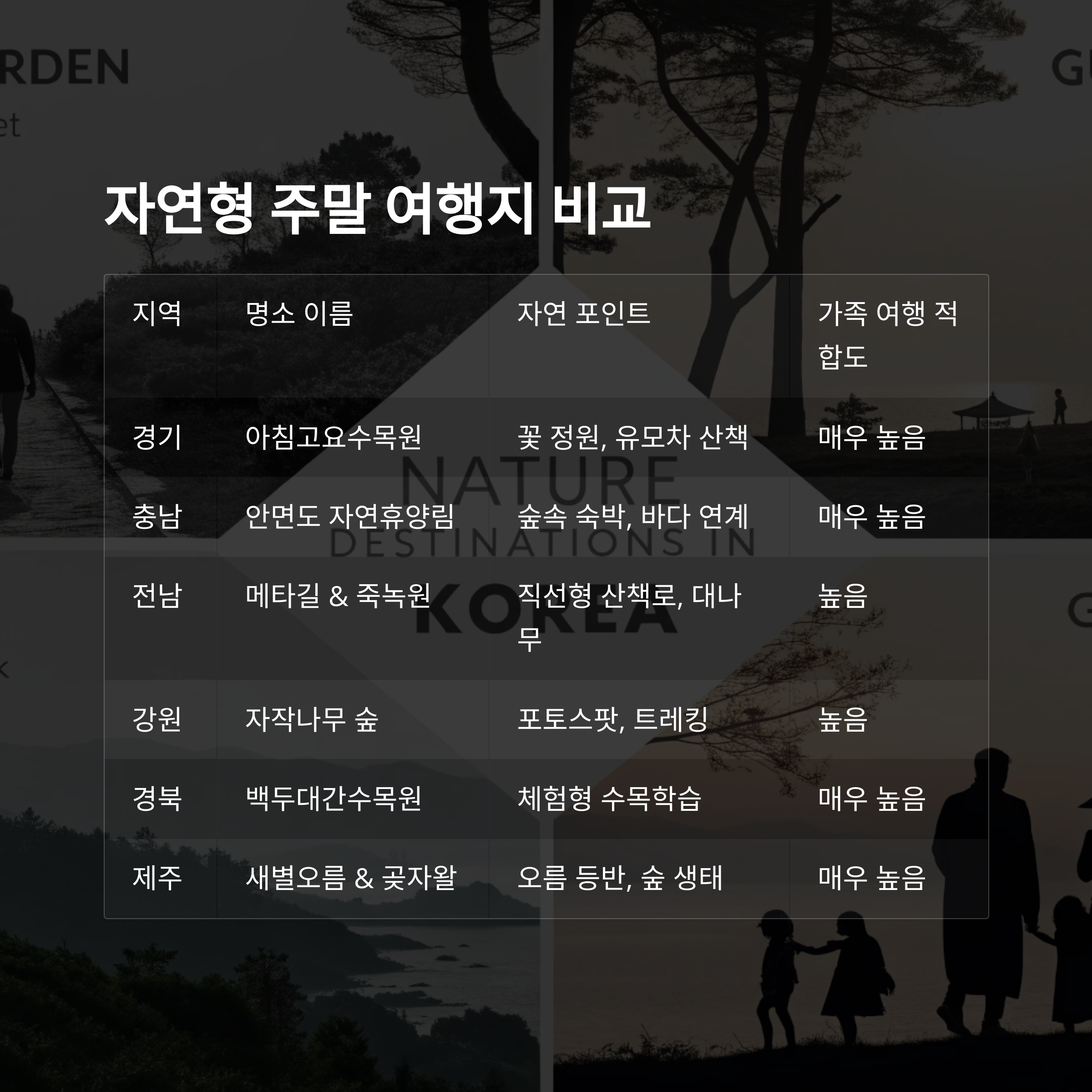 자연형 주말 여행지 비교표