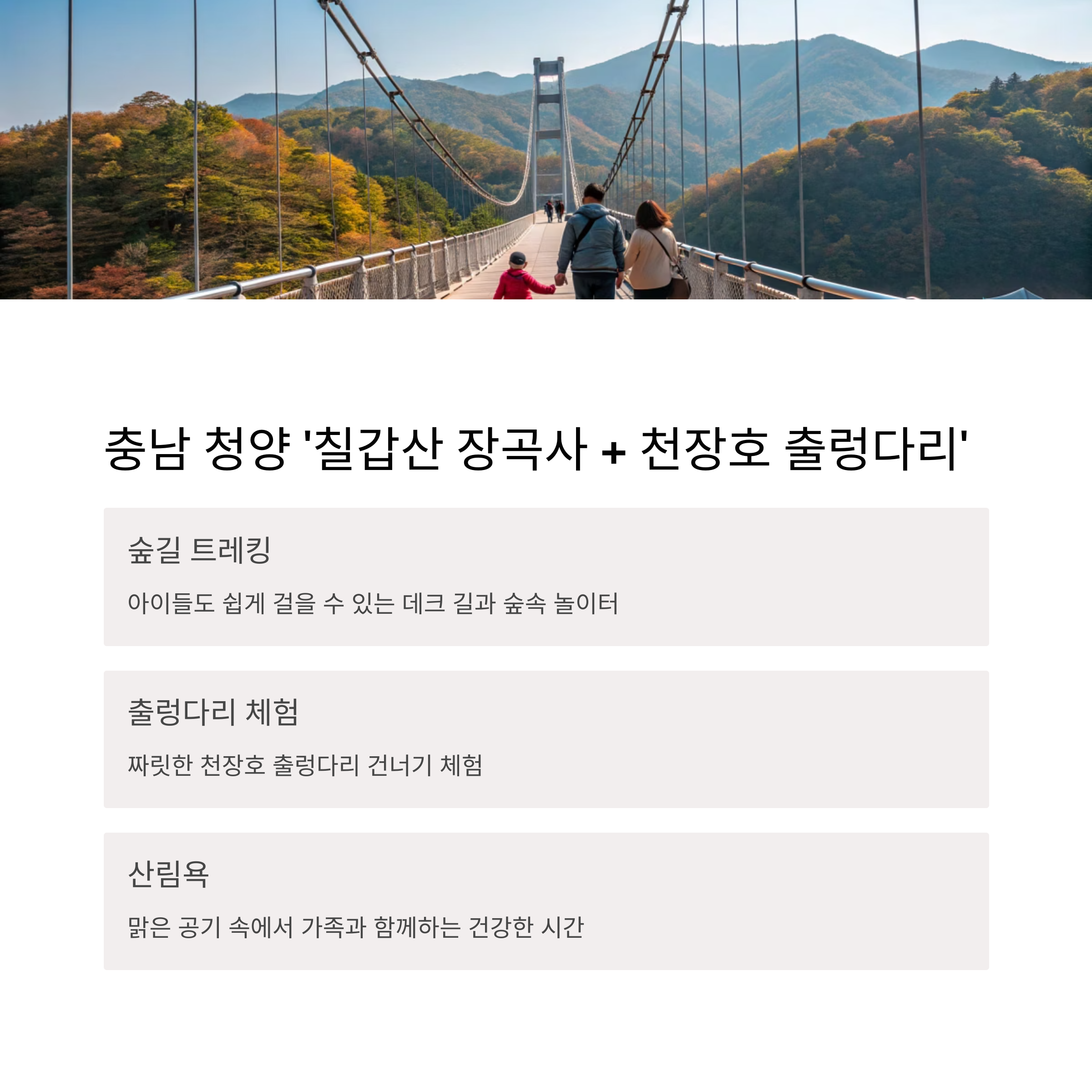 | 청양 | 칠갑산 | 출렁다리, 숲길 | 트레킹 초급 |