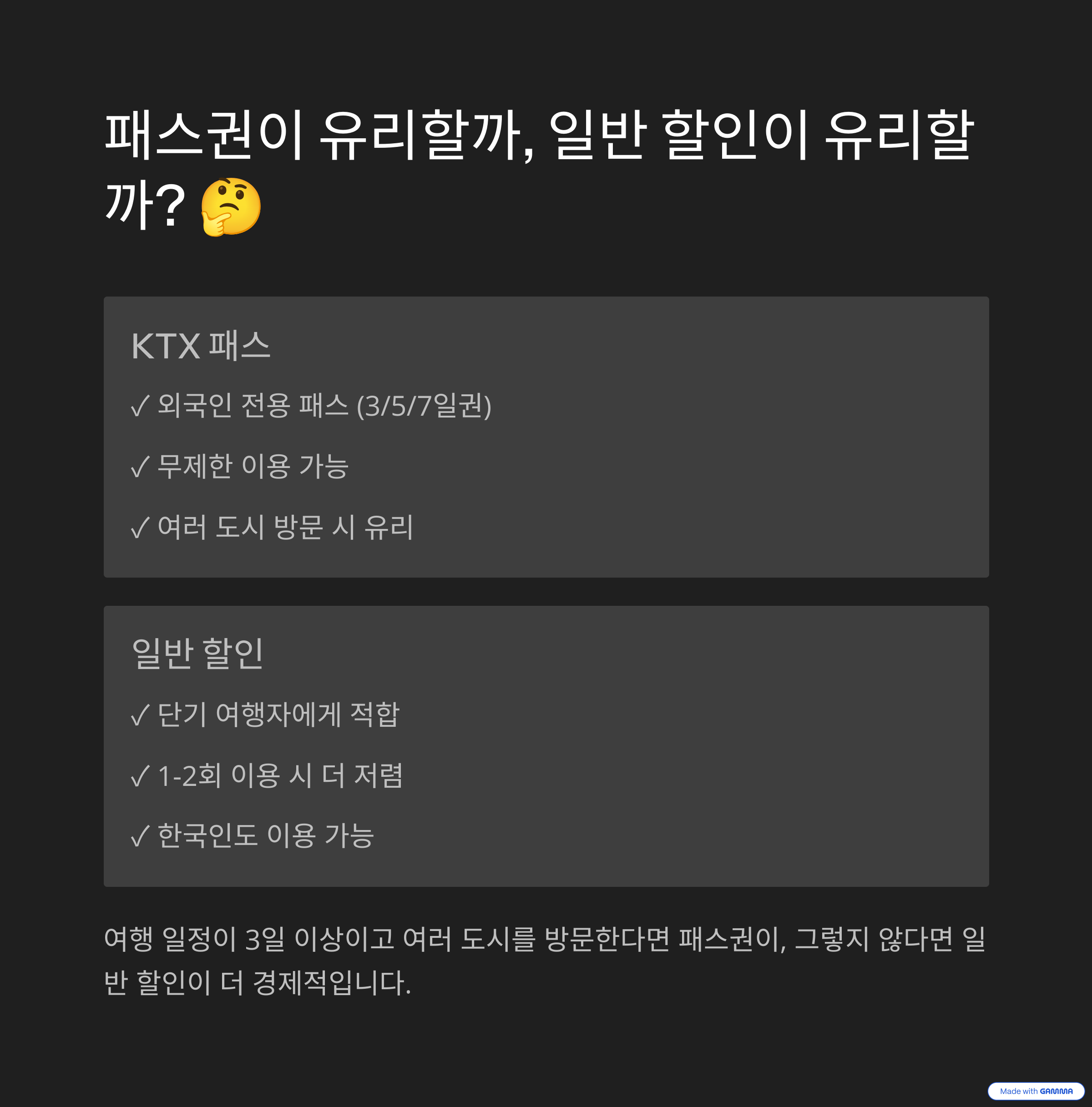 - 여행 목적이라면: 코레일패스 추천 (내국인용은 '하나로패스')