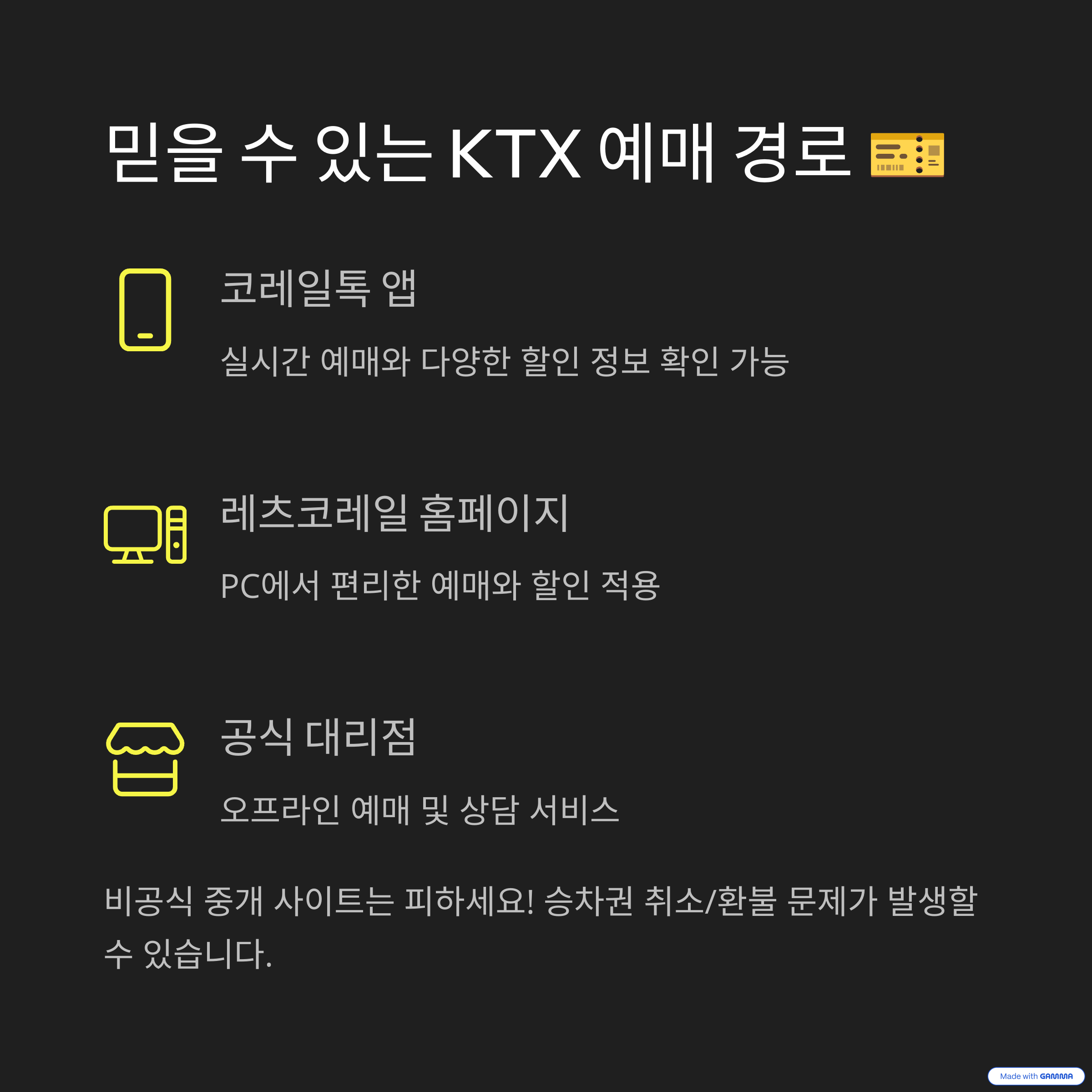 공식 할인 적용을 받으려면 반드시 코레일 공식 예매 경로를 이용해야 합니다.