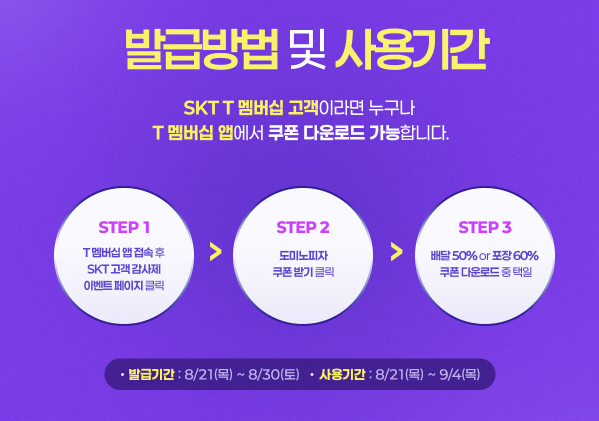 SKT 고객이라면 8월 21일부터 30일까지 T 멤버십 앱을 통해 도미노피자 할인쿠폰을 받을 수 있습니다.