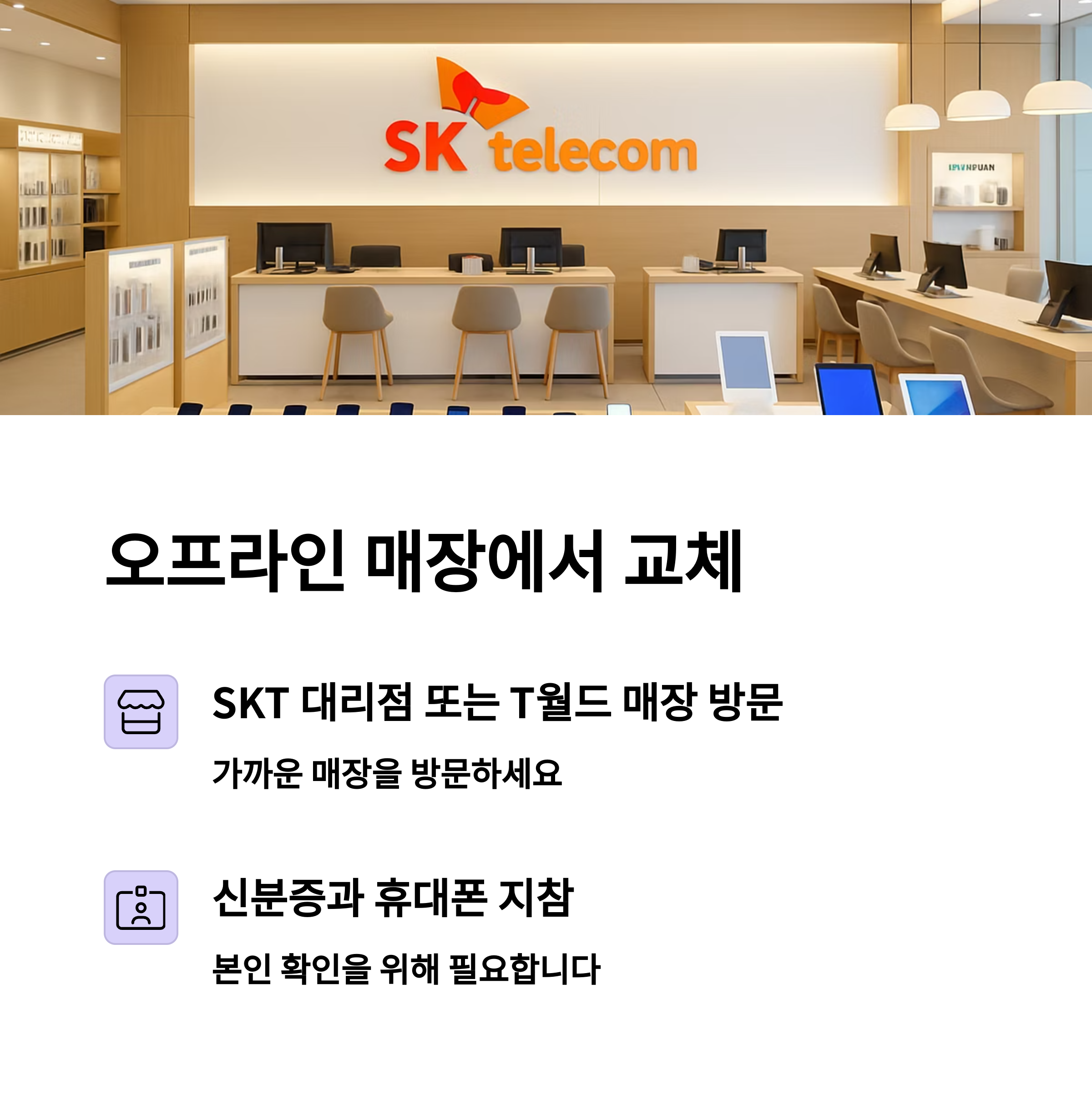 방문 시 본인 확인용 신분증(주민등록증, 운전면허증 등)을 지참해야 하며, eSIM 사용자도 무상 교체가 가능합니다.