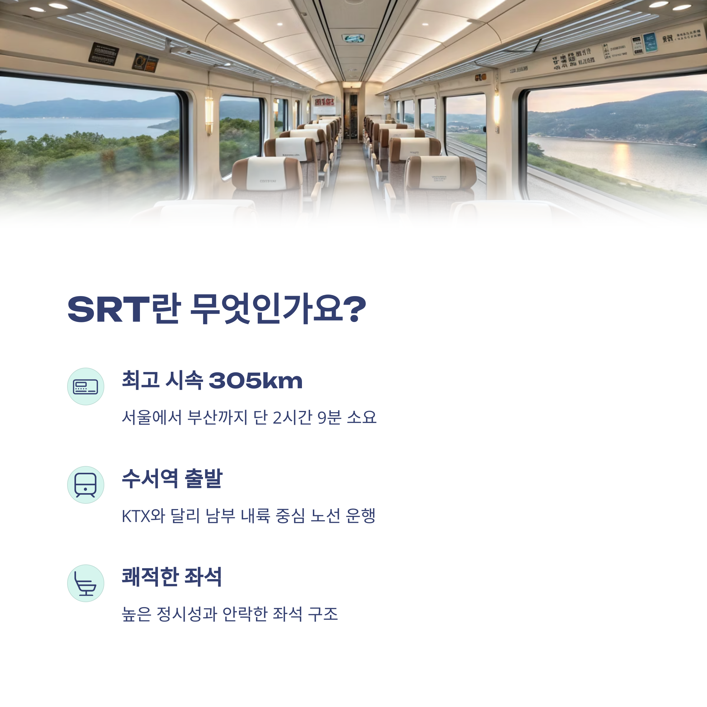 서울 수서역을 출발해 전국 주요 도시까지 빠르게 이동할 수 있어 많은 사람들이 애용합니다.