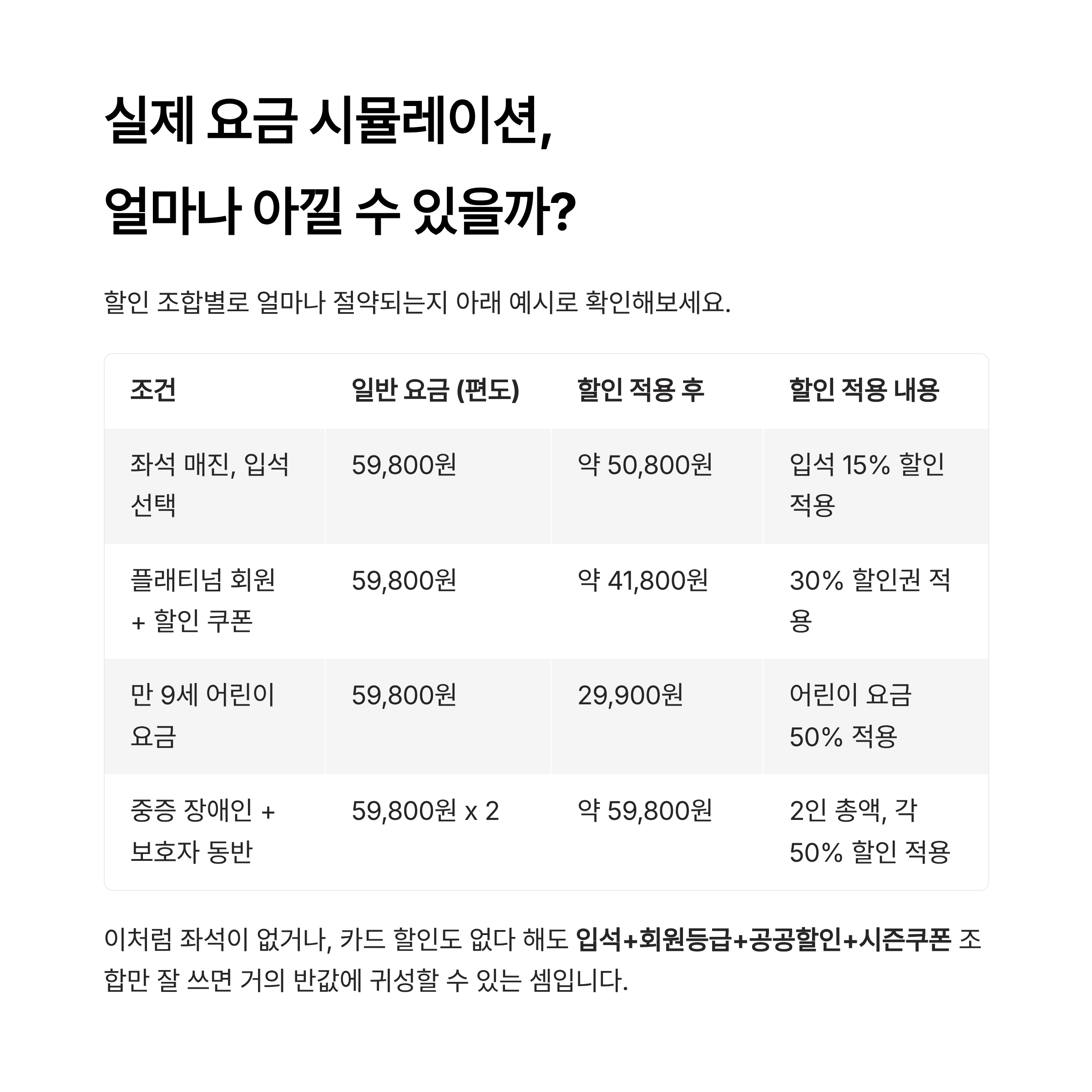 입석+회원등급+공공할인+시즌쿠폰 조합만 잘 쓰면