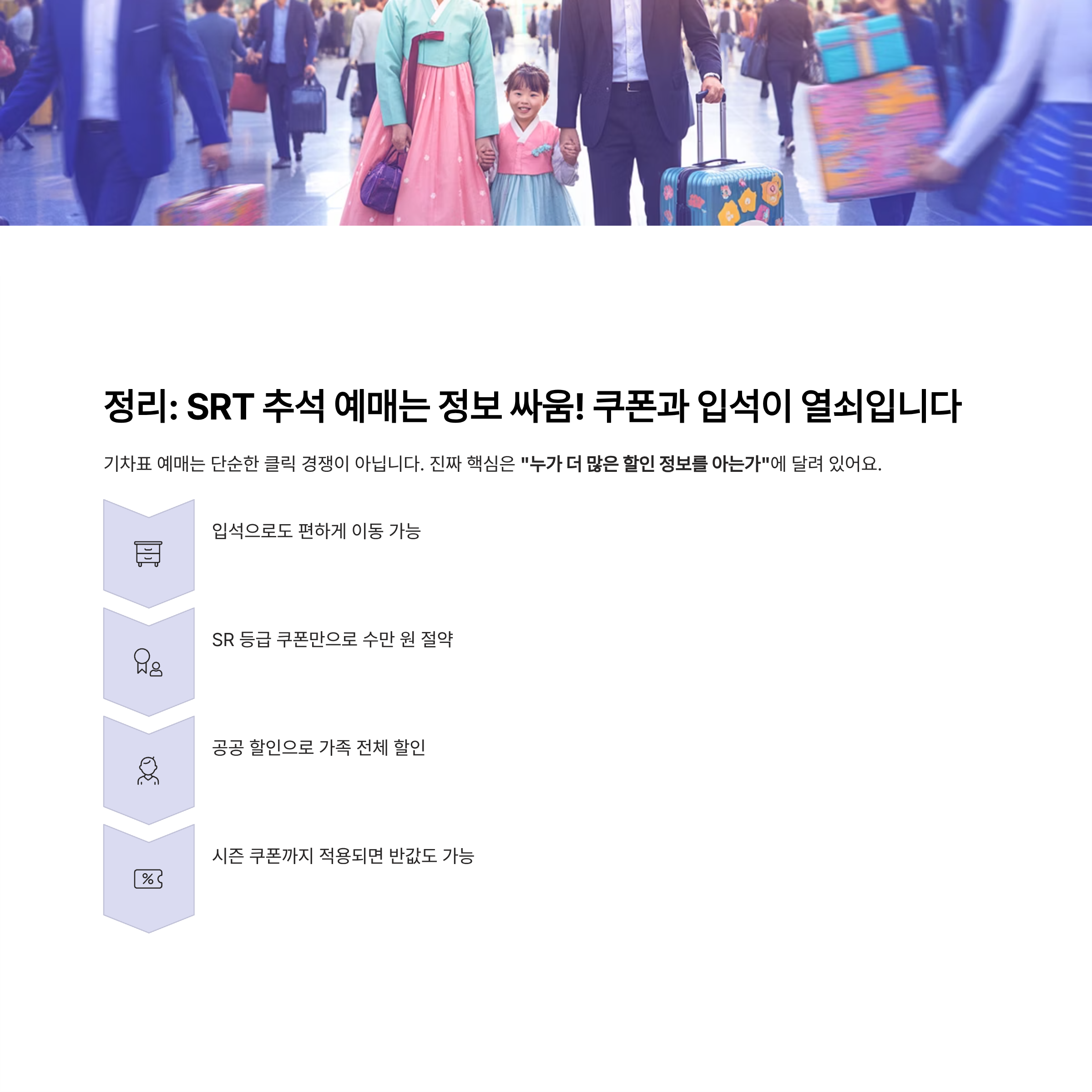 이번 글에서는 2025년 추석 SRT 예매 시 반드시 챙겨야 할 할인 꿀팁들을 한눈에 정리해드립니다.