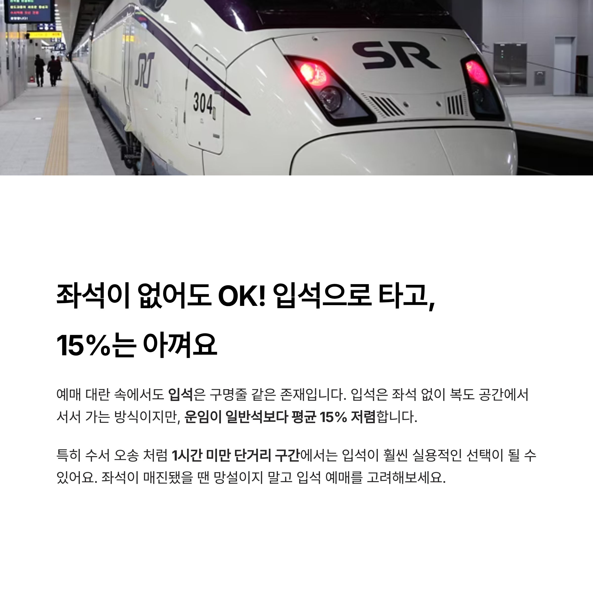 좌석이 없어도 OK! 입석으로 타고, 15%는 아껴요