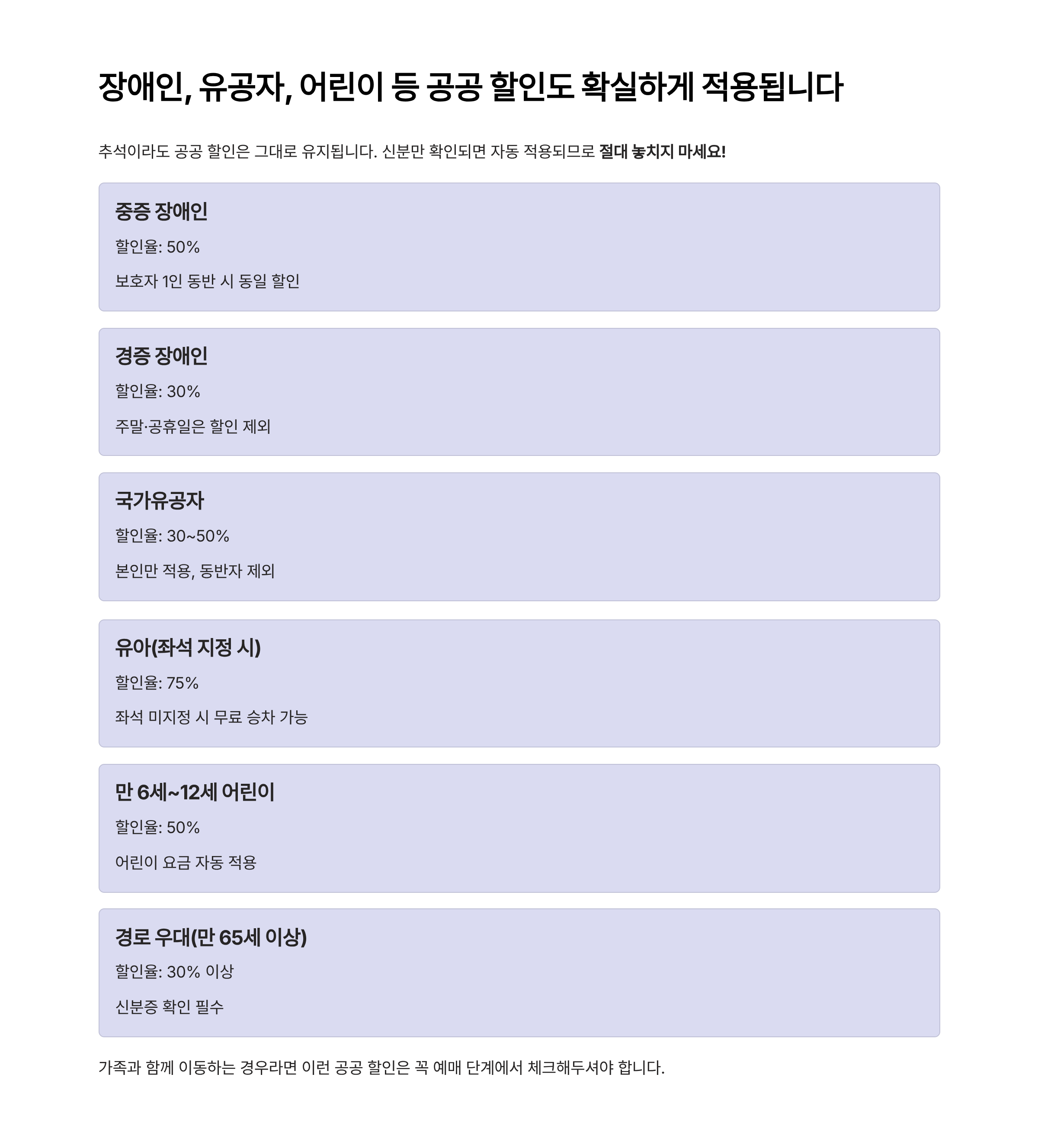 | 경로 우대(만 65세 이상) | 30% 이상 | 신분증 확인 필수 |