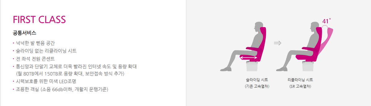 SRT 특실에서는 목베개, 전동 리클라이닝 시트(최대 41도), 항공기형 폐쇄형 선반, 식음료 서비스가 제공됩니다. 단, 최근 일부 서비스는 상황에 따라 운영이 달라질 수 있다는 점은 참고하셔야 합니다.